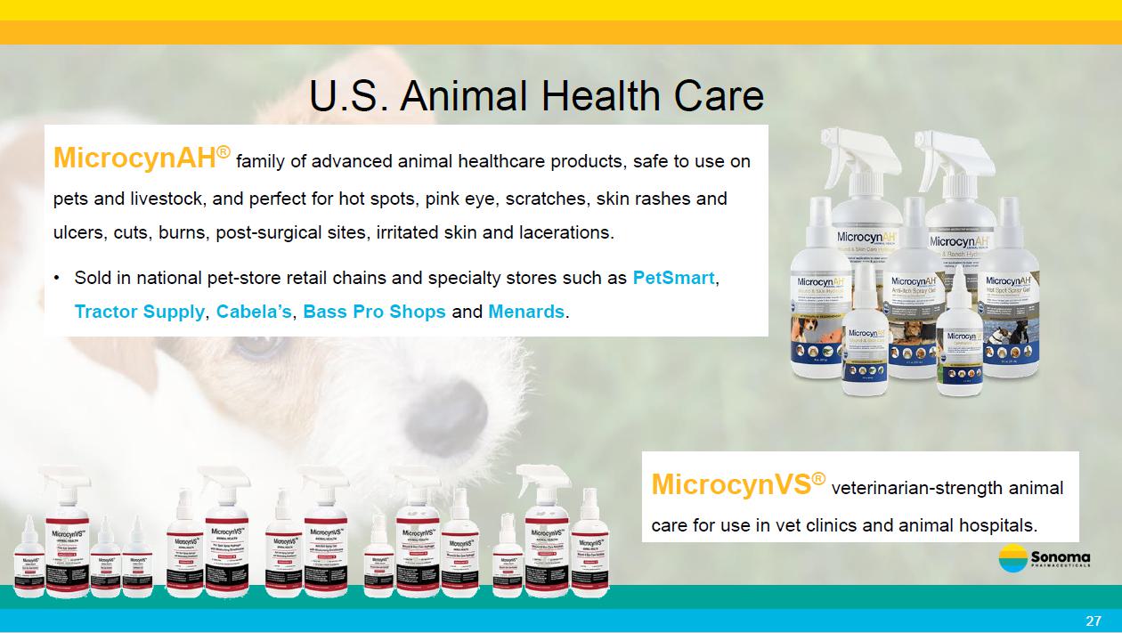 U.S. Animal Health Care MicrocynAH ® family of advanced animal healthcare products, safe to use on pets and livestock, and perfect for hot spots, pink eye, scratches, skin rashes and ulcers, cuts, burns, post - surgical sites, irritated skin and lacerations. • Sold in national pet - store retail chains and specialty stores such as PetSmart , Tractor Supply , Cabela’s , Bass Pro Shops and Menards . MicrocynVS ® veterinarian - strength animal care for use in vet clinics and animal hospitals. 27