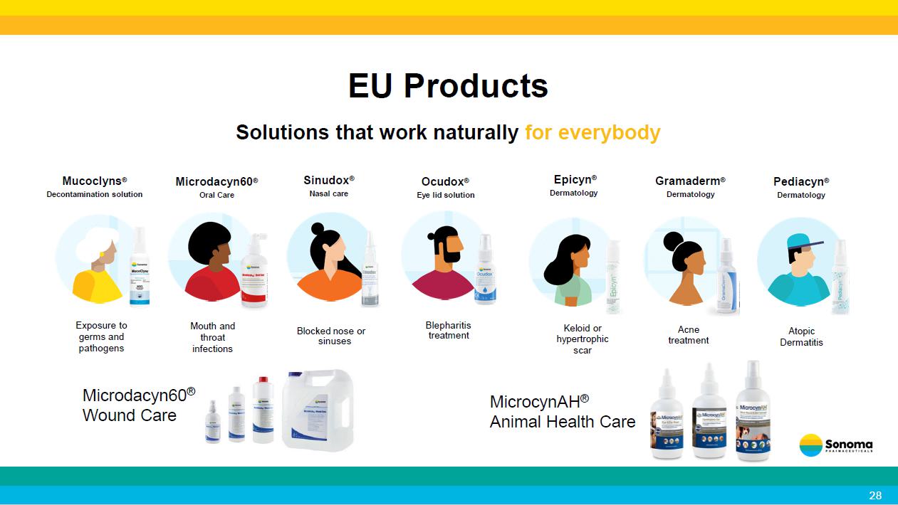 Epicyn ® Dermatology Gramaderm ® Dermatology Pediacyn ® Dermatology Mucoclyns ® Decontamination solution Microdacyn60 ® Oral Care Blocked nose or sinuses Sinudox ® Nasal care Blepharitis treatment Ocudox ® Eye lid solution Exposure to germs and pathogens Mouth and throat infections Keloid or hypertrophic scar Acne treatment Atopic Dermatitis Solutions that work naturally for everybody EU Products Microdacyn60 ® Wound Care MicrocynAH ® Animal Health Care 28