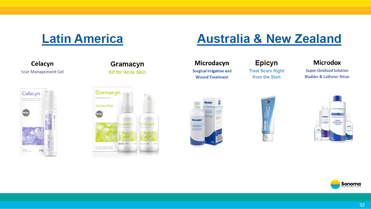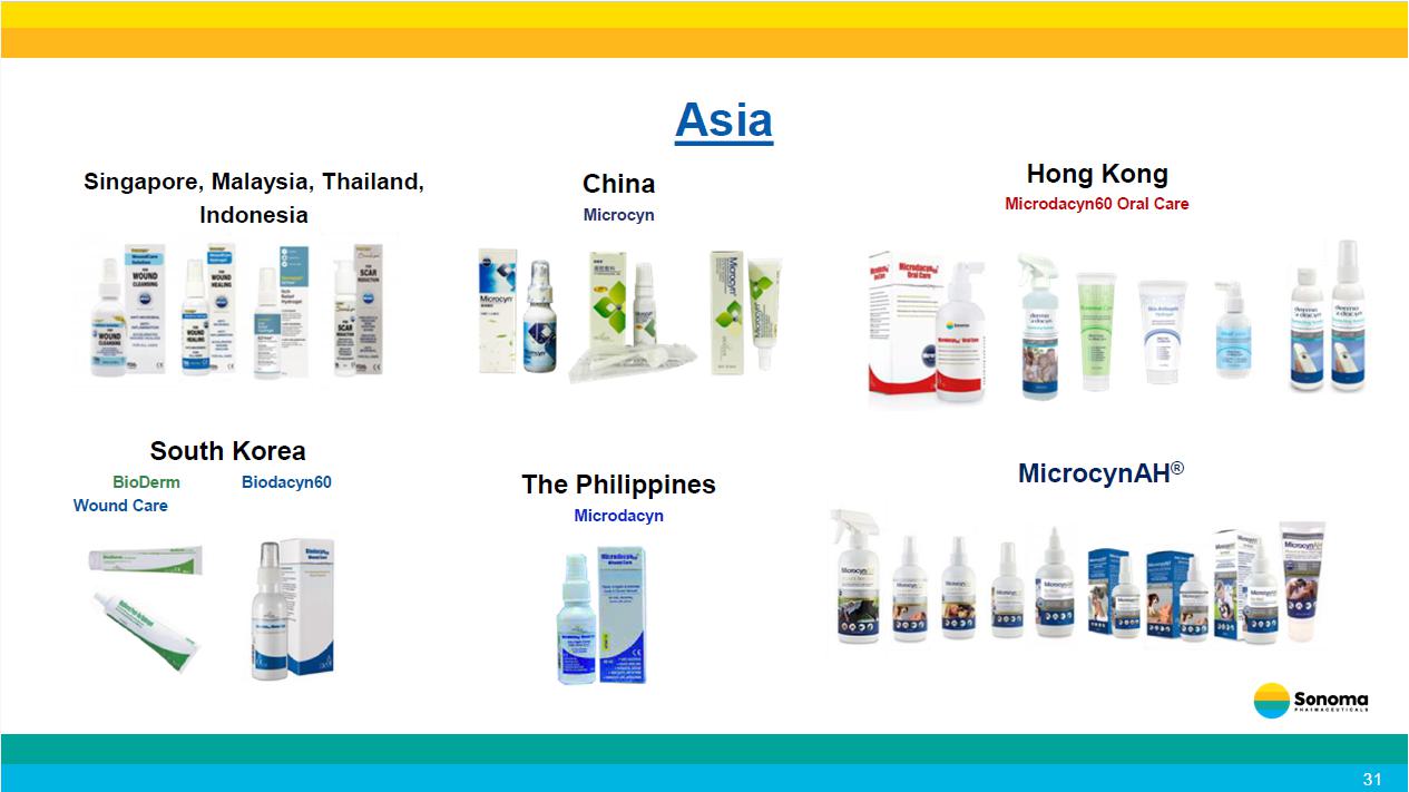 Singapore, Malaysia, Thailand, Indonesia Wound Care South Korea BioDerm Biodacyn60 Wound Care Hong Kong Microdacyn60 Oral Care China Microcyn The Philippines Microdacyn MicrocynAH ® Asia 31
