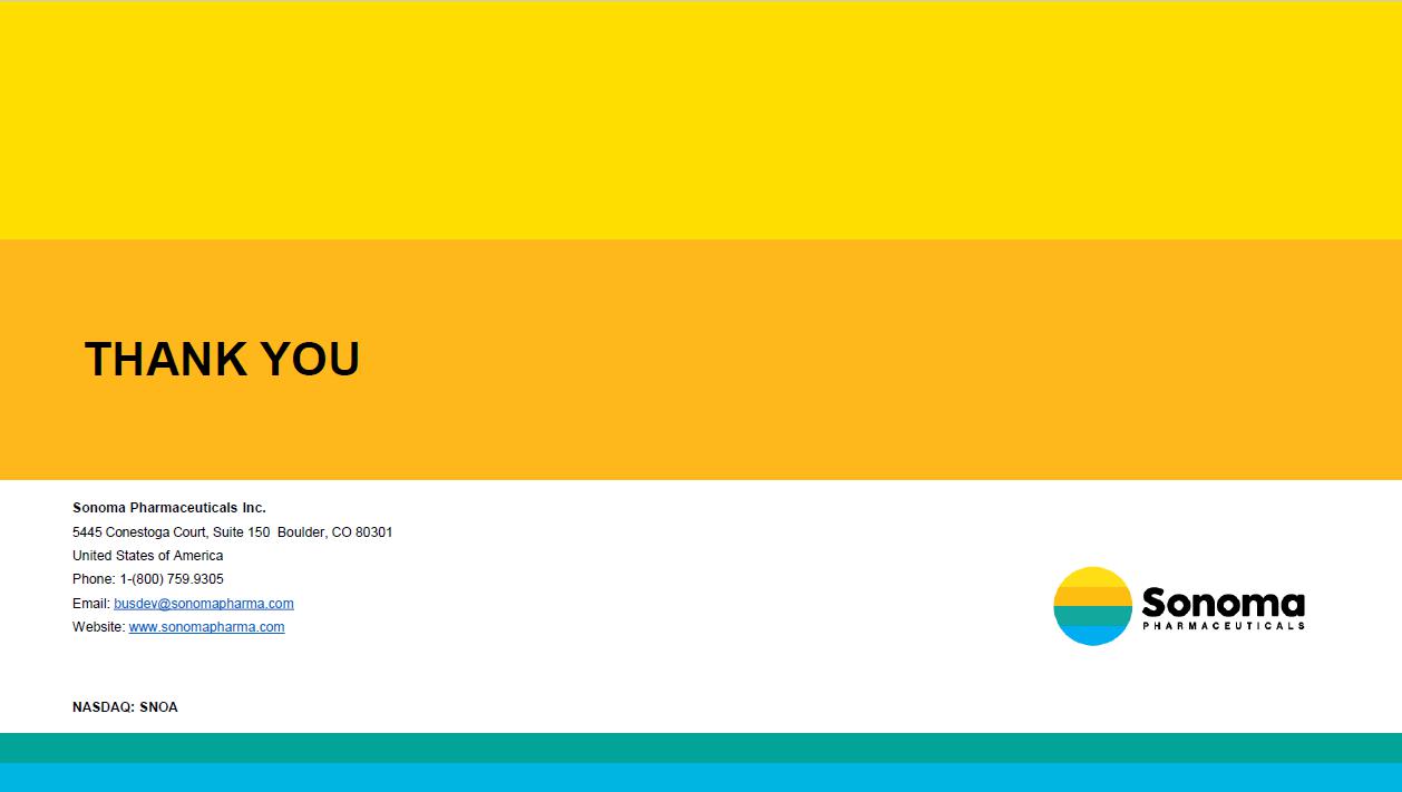 THANK YOU Sonoma Pharmaceuticals Inc. 5445 Conestoga Court, Suite 150 Boulder, CO 80301 United States of America Phone: 1 - (800) 759.9305 Email: busdev@sonomapharma.com Website: www.sonomapharma.com NASDAQ: SNOA