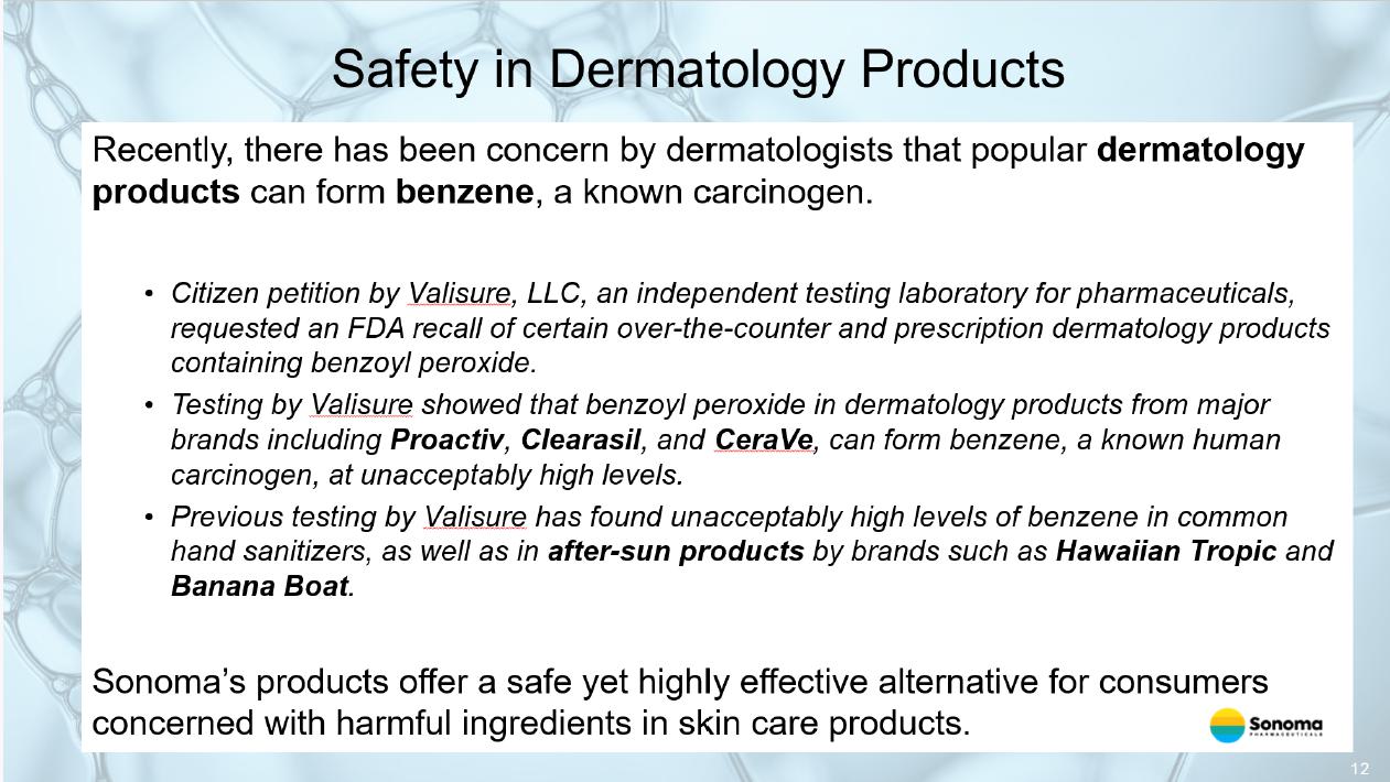 Safety in Dermatology Products ers Recently, there has been concern by dermatologists that popular dermatology products can form benzene , a known carcinogen. • Citizen petition by Valisure, LLC, an independent testing laboratory for pharmaceuticals, requested an FDA recall of certain over - the - counter and prescription dermatology products containing benzoyl peroxide. • Testing by Valisure showed that benzoyl peroxide in dermatology products from major brands including Proactiv , Clearasil , and CeraVe , can form benzene, a known human carcinogen, at unacceptably high levels. • Previous testing by Valisure has found unacceptably high levels of benzene in common hand sanitizers, as well as in after - sun products by brands such as Hawaiian Tropic and Banana Boat . Sonoma’s products offer a safe yet highly effective alternative for consum concerned with harmful ingredients in skin care products. 12