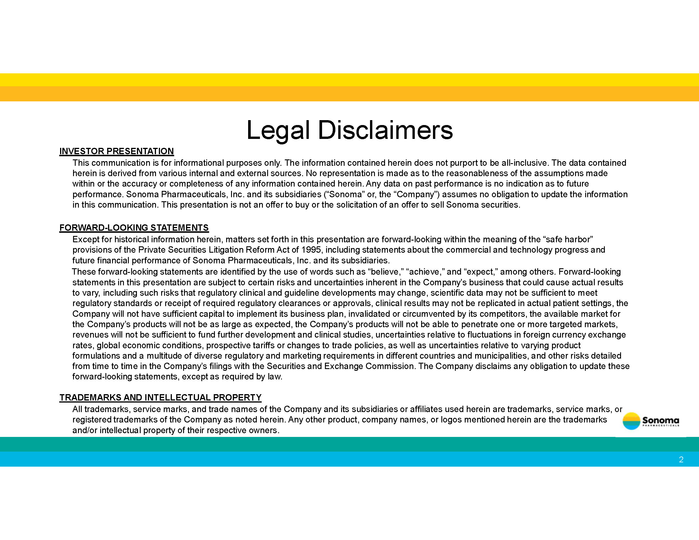 Legal Disclaimers or INVESTOR PRESENTATION This communication is for informational purposes only. The information contained herein does not purport to be all - inclusive. The data contained herein is derived from various internal and external sources. No representation is made as to the reasonableness of the assumptions made within or the accuracy or completeness of any information contained herein. Any data on past performance is no indication as to future performance. Sonoma Pharmaceuticals, Inc. and its subsidiaries (“Sonoma” or, the “Company”) assumes no obligation to update the information in this communication. This presentation is not an offer to buy or the solicitation of an offer to sell Sonoma securities. FORWARD - LOOKING STATEMENTS Except for historical information herein, matters set forth in this presentation are forward - looking within the meaning of the “safe harbor” provisions of the Private Securities Litigation Reform Act of 1995, including statements about the commercial and technology progress and future financial performance of Sonoma Pharmaceuticals, Inc. and its subsidiaries. These forward - looking statements are identified by the use of words such as “believe,” “achieve,” and “expect,” among others. Forward - looking statements in this presentation are subject to certain risks and uncertainties inherent in the Company’s business that could cause actual results to vary, including such risks that regulatory clinical and guideline developments may change, scientific data may not be sufficient to meet regulatory standards or receipt of required regulatory clearances or approvals, clinical results may not be replicated in actual patient settings, the Company will not have sufficient capital to implement its business plan, invalidated or circumvented by its competitors, the available market for the Company’s products will not be as large as expected, the Company’s products will not be able to penetrate one or more targeted markets, revenues will not be sufficient to fund further development and clinical studies, uncertainties relative to fluctuations in foreign currency exchange rates, global economic conditions, prospective tariffs or changes to trade policies, as well as uncertainties relative to varying product formulations and a multitude of diverse regulatory and marketing requirements in different countries and municipalities, and other risks detailed from time to time in the Company’s filings with the Securities and Exchange Commission. The Company disclaims any obligation to update these forward - looking statements, except as required by law. TRADEMARKS AND INTELLECTUAL PROPERTY All trademarks, service marks, and trade names of the Company and its subsidiaries or affiliates used herein are trademarks, service marks, registered trademarks of the Company as noted herein. Any other product, company names, or logos mentioned herein are the trademarks and/or intellectual property of their respective owners. 2