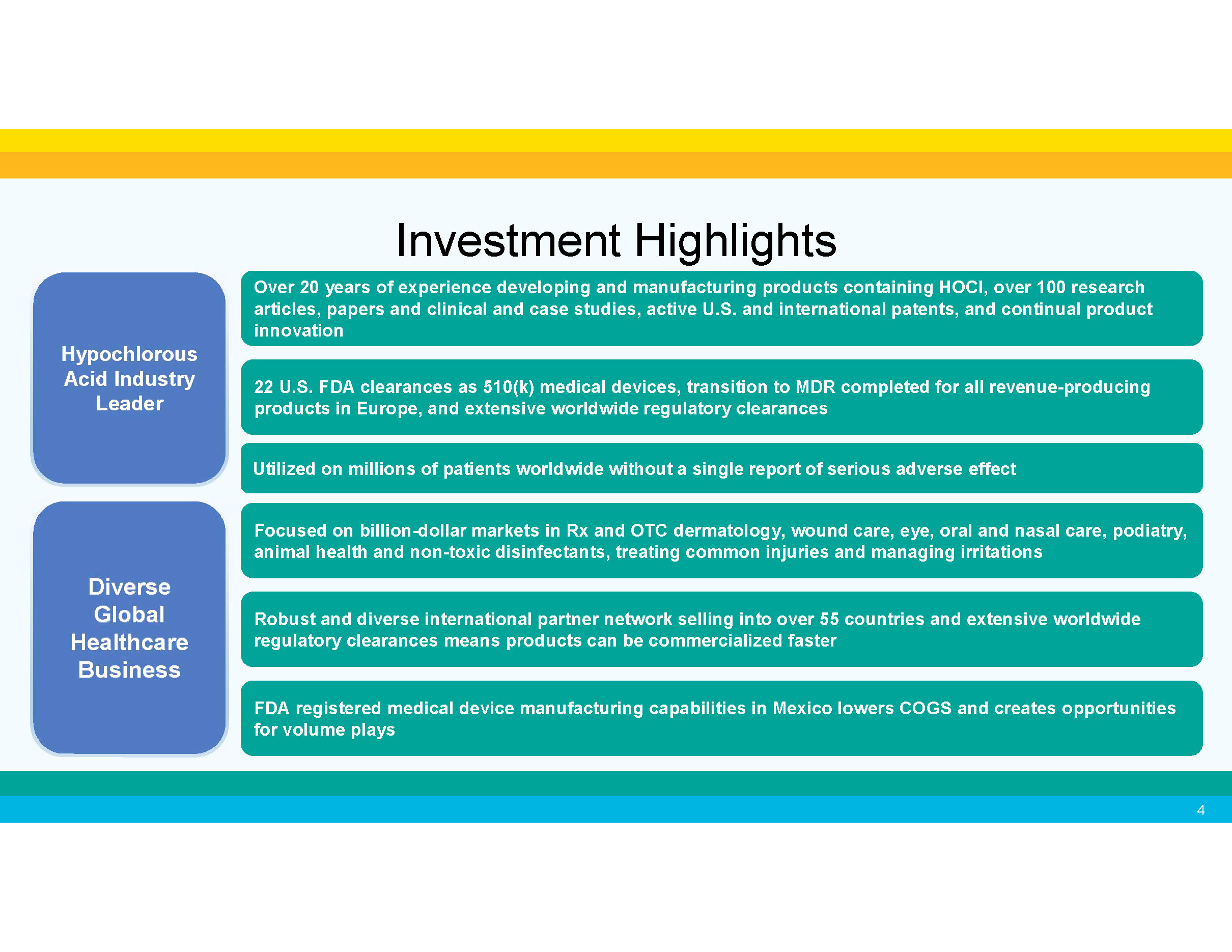 Hypochlorous Acid Industry Leader Hypochlorous Acid Industry Leader 22 U.S. FDA clearances as 510(k) medical devices, transition to MDR completed for all revenue - producing products in Europe, and extensive worldwide regulatory clearances Utilized on millions of patients worldwide without a single report of serious adverse effect Focused on billion - dollar markets in Rx and OTC dermatology, wound care, eye, oral and nasal care, podiatry, animal health and non - toxic disinfectants, treating common injuries and managing irritations Diverse Global Healthcare Business Diverse Global Healthcare Business Investment Highlights Over 20 years of experience developing and manufacturing products containing HOCl, over 100 research articles, papers and clinical and case studies, active U.S. and international patents, and continual product innovation Robust and diverse international partner network selling into over 55 countries and extensive worldwide regulatory clearances means products can be commercialized faster FDA registered medical device manufacturing capabilities in Mexico lowers COGS and creates opportunities for volume plays 4