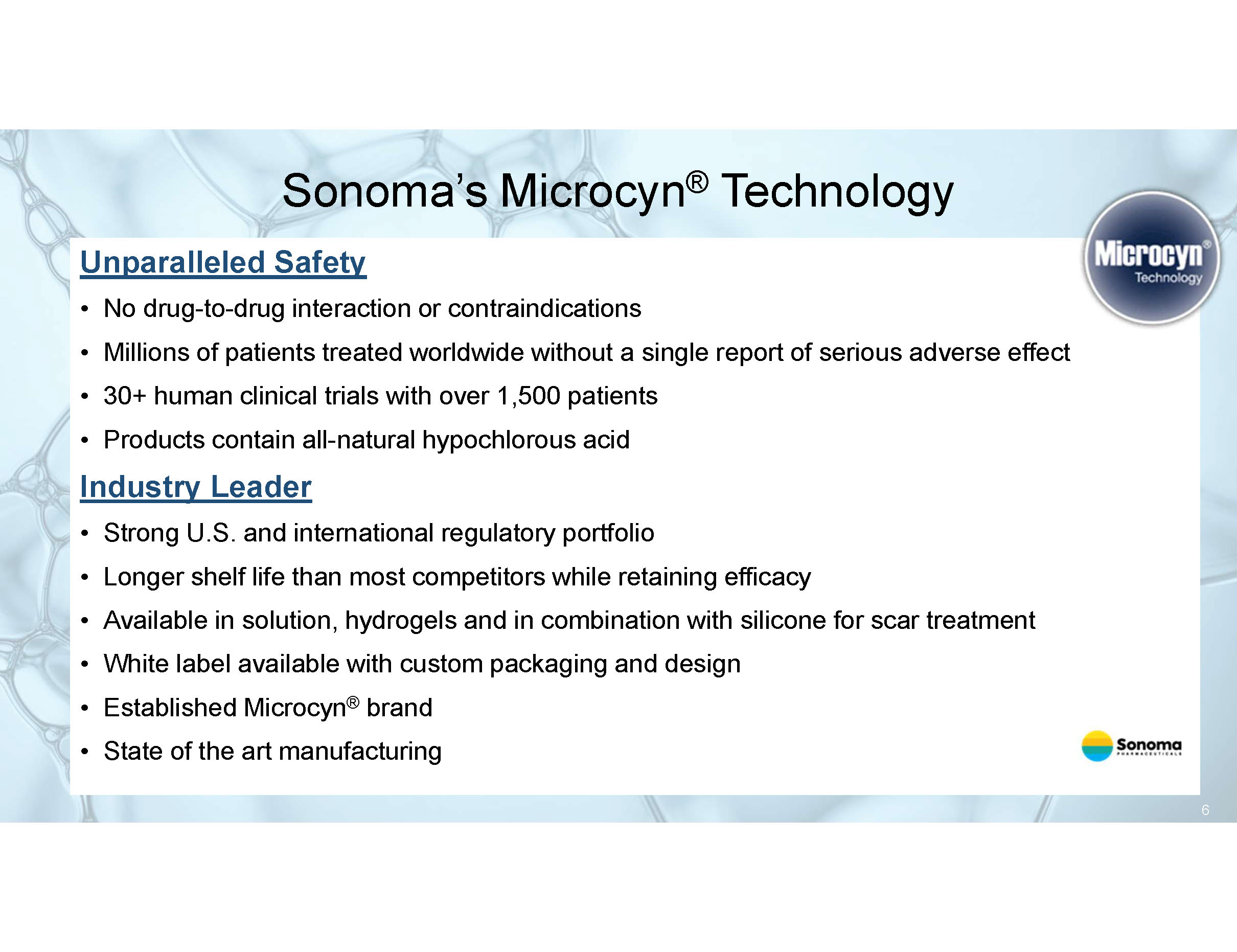 Sonoma’s Microcyn ® Technology Patented, Stabilized Triple - Action Topical Technology • HOCl kills microbes including bacteria, fungi and viruses while assisting healing • Relieves pain and itch • Improves wound care by cleaning and moistening the wound and peri - wound area • Safely manage skin abrasions, lacerations, minor irritations, cuts, burns, and intact skin • Applications in dermatology include atopic dermatitis, scar treatment and daily care May replace other treatments with side effects or health concerns • Overused antibiotics may cause deadly epidemics such as MRSA • May replace steroids for some patients • Avoids harmful ingredients such as benzoyl peroxide Cost Effective • Reduces hospital/physician visits • Medicare/hospital savings from reduced hospital stays 5