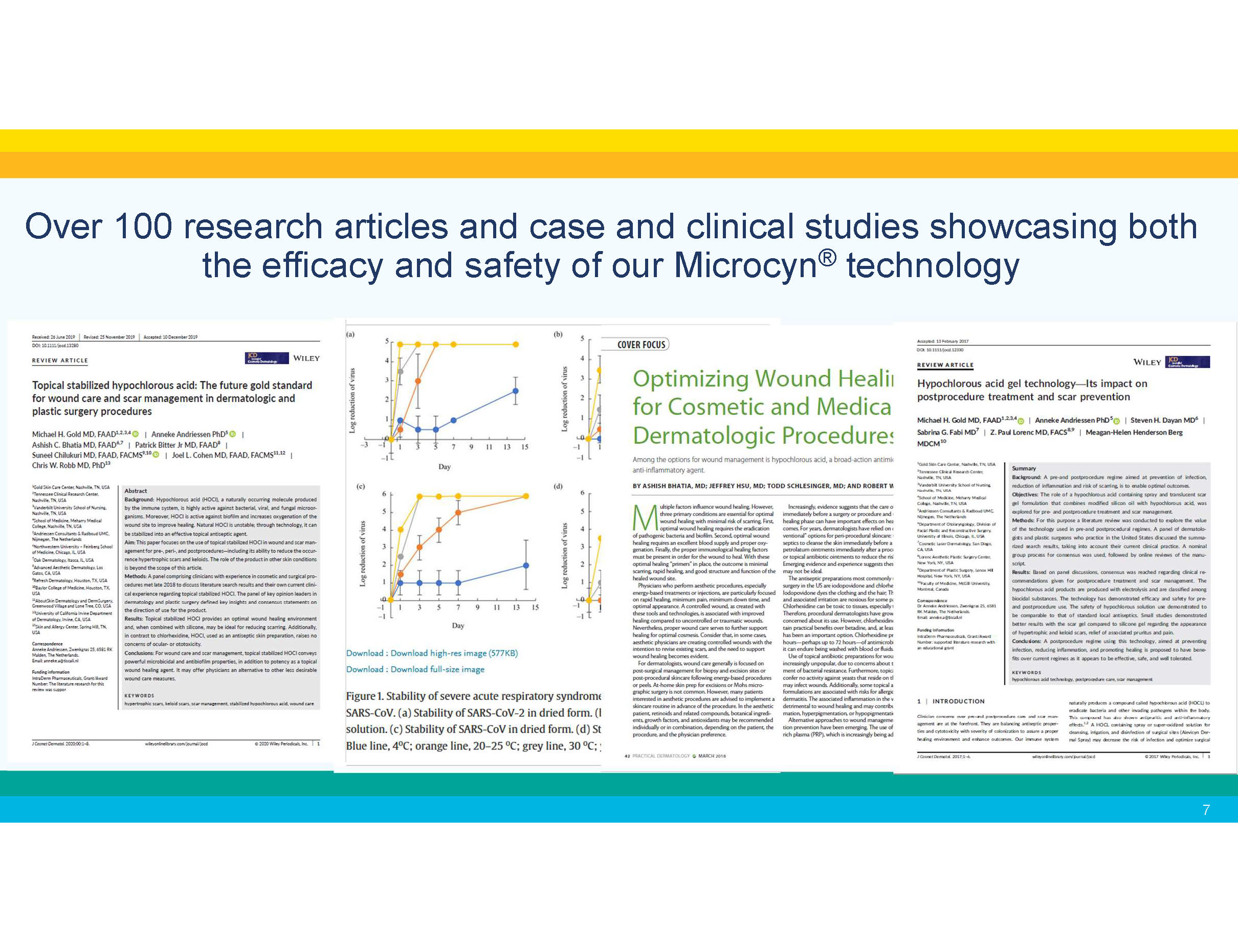 Over 100 research articles and case and clinical studies showcasing both the efficacy and safety of our Microcyn ® technology • Dermodacyn® Disinfecting solution study on viability of SARS - CoV - 2, see https:// www.sciencedirect.com/science/article/pii/S019567012030339X • Endocyn® study on cellular toxicity, see https:// www.sciencedirect.com/science/article/abs/pii/S0099239917310439 • HOCl study evaluating virucidal activity in Vero E6 cells against SARS - CoV - 2, University of Barcelona, 11/27/2020 • Hypochlorous acid gel technology — Its impact on post - procedure treatment and scar prevention, see https://sonomapharma.com/wp - content/uploads/2020/08/Gold_et_al - 2017 - Journal_of_Cosmetic_Dermatology - 003.pdf • Topical stabilized hypochlorous acid: The future gold standard for wound care and scar management in dermatologic and plastic surgery procedures, see https://sonomapharma.com/wp - content/uploads/2020/08/Topical - Stabilized - HOCL - consensus - article - 2020.pdf • HOCl Article: Optimizing Wound Healing for Procedures – Apr 2018, see https://sonomapharma.com/wp - content/uploads/2018/11/Pracitcal - Derm - HOCl - article - 4 - 7 - 18 - wounds.pdf 7