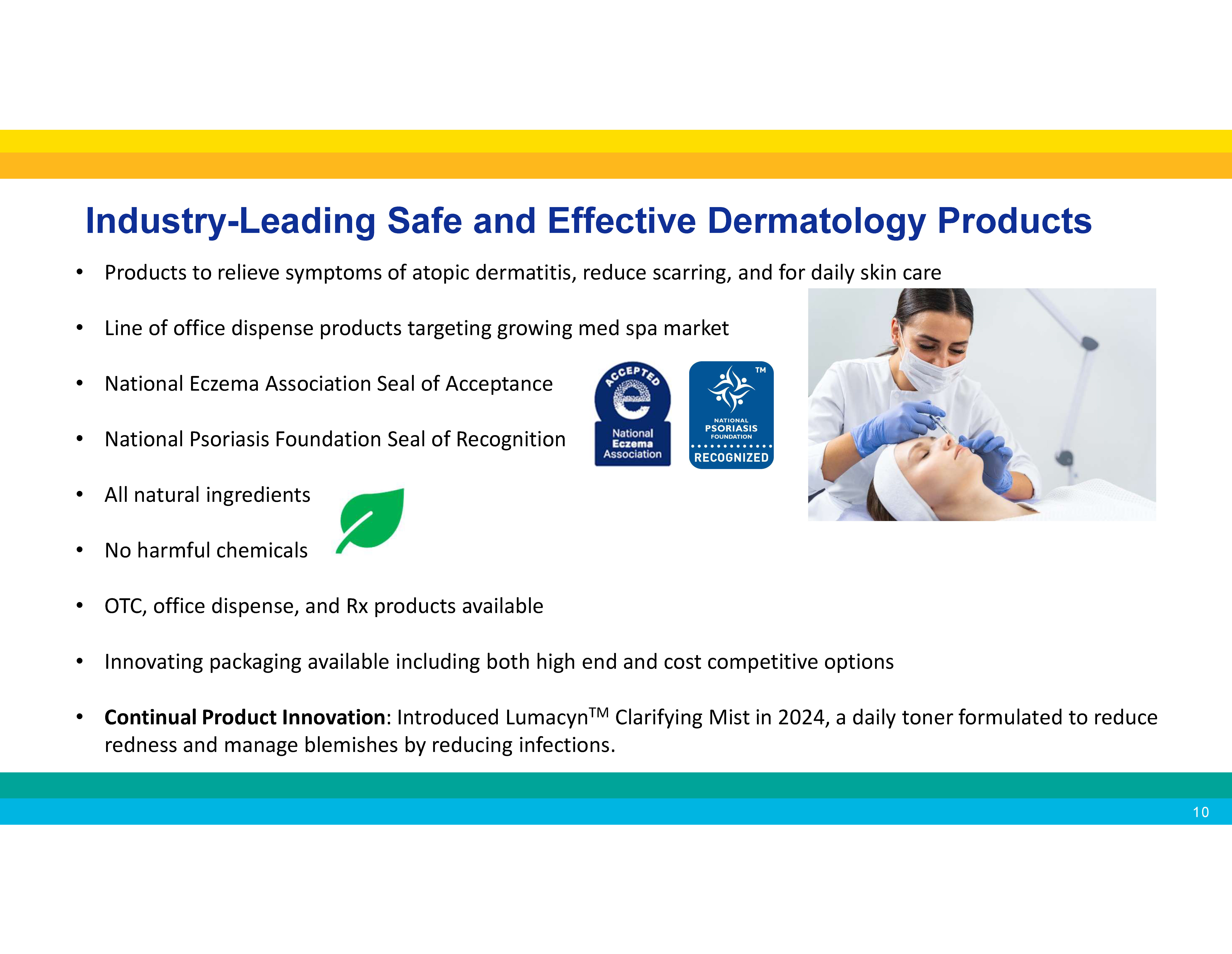 Industry - Leading Safe and Effective Dermatology Products • Products to relieve symptoms of atopic dermatitis, reduce scarring, and for daily skin care • Line of office dispense products targeting growing med spa market • National Eczema Association Seal of Acceptance • National Psoriasis Foundation Seal of Recognition • All natural ingredients • No harmful chemicals • OTC, office dispense, and Rx products available • Innovating packaging available including both high end and cost competitive options • Continual Product Innovation : Introduced Lumacyn TM Clarifying Mist in 2024, a daily toner formulated to reduce redness and manage blemishes by reducing infections. 10