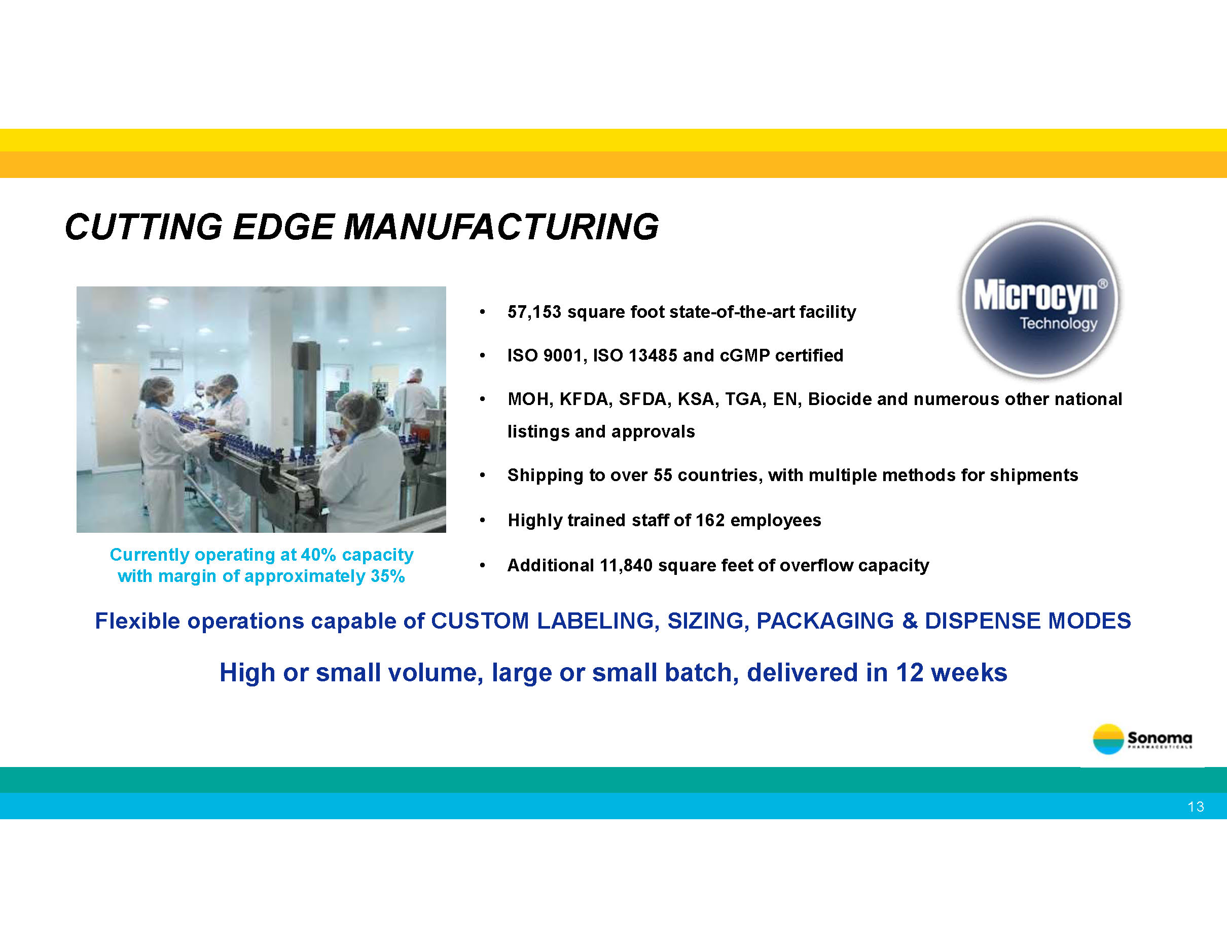 • 57,153 square foot state - of - the - art facility • ISO 9001, ISO 13485 and cGMP certified • MOH, KFDA, SFDA, KSA, TGA, EN, Biocide and numerous other national listings and approvals • Shipping to over 55 countries, with multiple methods for shipments • Highly trained staff of 162 employees • Additional 11,840 square feet of overflow capacity CUTTING EDGE MANUFACTURING Flexible operations capable of CUSTOM LABELING, SIZING, PACKAGING & DISPENSE MODES High or small volume, large or small batch, delivered in 12 weeks Currently operating at 40% capacity with margin of approximately 35% 13
