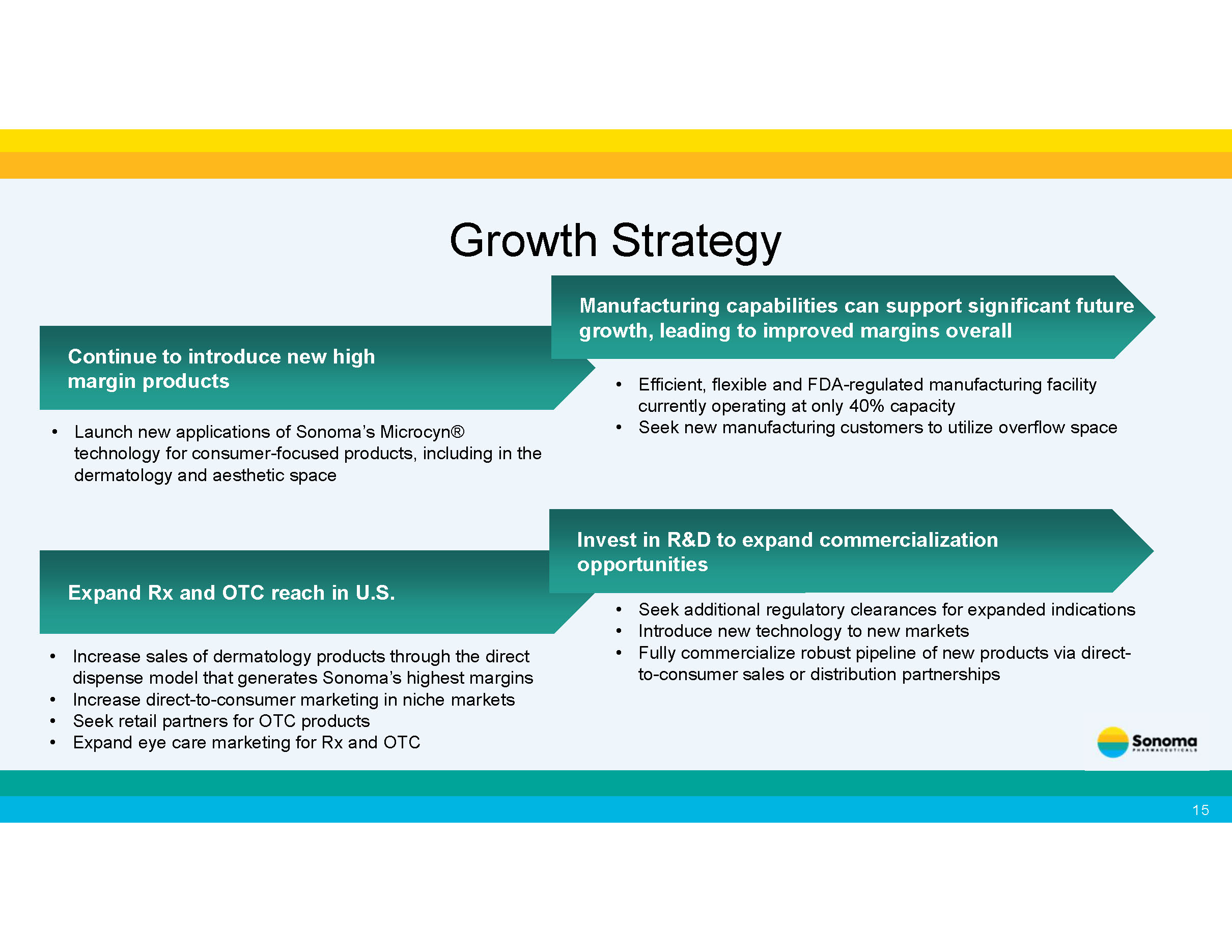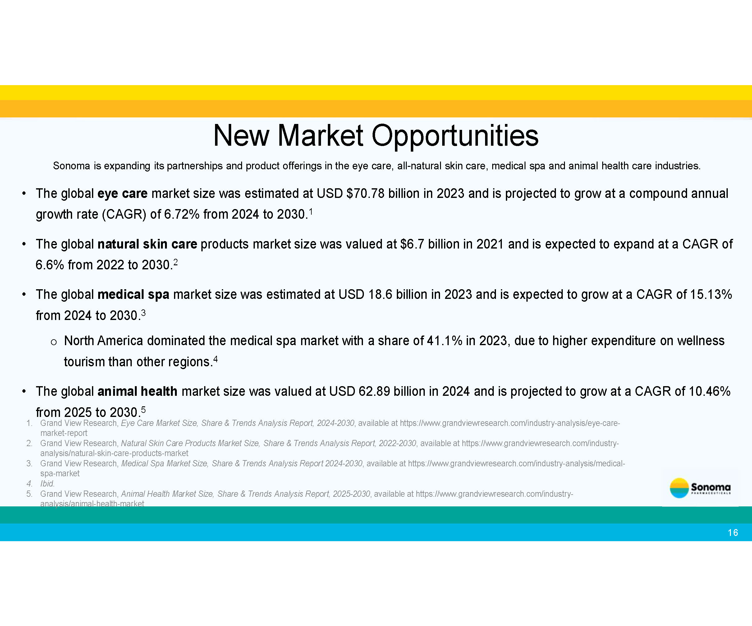 New Market Opportunities Sonoma is expanding its partnerships and product offerings in the eye care, all - natural skin care, medical spa and animal health care industries. • The global eye care market size was estimated at USD $70.78 billion in 2023 and is projected to grow at a compound annual growth rate (CAGR) of 6.72% from 2024 to 2030. 1 • The global natural skin care products market size was valued at $6.7 billion in 2021 and is expected to expand at a CAGR of 6.6% from 2022 to 2030. 2 • The global medical spa market size was estimated at USD 18.6 billion in 2023 and is expected to grow at a CAGR of 15.13% from 2024 to 2030. 3 o North America dominated the medical spa market with a share of 41.1% in 2023, due to higher expenditure on wellness tourism than other regions. 4 • The global animal health market size was valued at USD 62.89 billion in 2024 and is projected to grow at a CAGR of 10.46% from 2025 to 2030. 5 1. Grand View Research, Eye Care Market Size, Share & Trends Analysis Report, 2024 - 2030 , available at https:// www.grandviewresearch.com/industry - analysis/eye - care - market - report 2. Grand View Research, Natural Skin Care Products Market Size, Share & Trends Analysis Report, 2022 - 2030 , available at https:// www.grandviewresearch.com/industry - analysis/natural - skin - care - products - market 3. Grand View Research, Medical Spa Market Size, Share & Trends Analysis Report 2024 - 2030 , available at https:// www.grandviewresearch.com/industry - analysis/medical - spa - market 4. Ibid. 5. Grand View Research, Animal Health Market Size, Share & Trends Analysis Report, 2025 - 2030 , available at https:// www.grandviewresearch.com/industry - analysis/animal - health - market 16