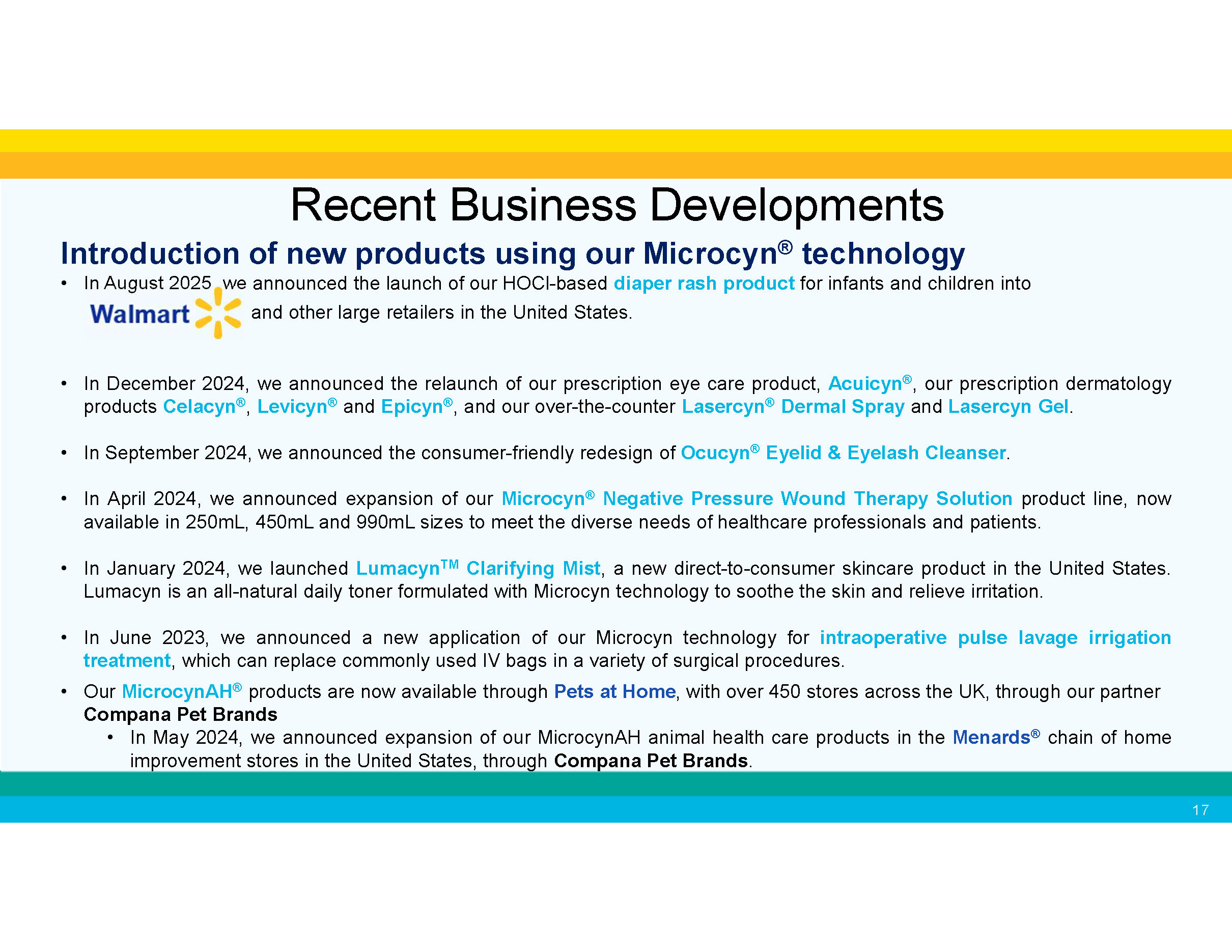 Introduction of new products using our Microcyn ® technology • In August 2025 we announced the launch of our HOCl - based diaper rash product for infants and children into and other large retailers in the United States. • In December 2024, we announced the relaunch of our prescription eye care product, Acuicyn ® , our prescription dermatology products Celacyn ® , Levicyn ® and Epicyn ® , and our over - the - counter Lasercyn ® Dermal Spray and Lasercyn Gel . • In September 2024, we announced the consumer - friendly redesign of Ocucyn ® Eyelid & Eyelash Cleanser . • In April 2024, we announced expansion of our Microcyn ® Negative Pressure Wound Therapy Solution product line, now available in 250mL, 450mL and 990mL sizes to meet the diverse needs of healthcare professionals and patients. • In January 2024, we launched Lumacyn TM Clarifying Mist , a new direct - to - consumer skincare product in the United States. Lumacyn is an all - natural daily toner formulated with Microcyn technology to soothe the skin and relieve irritation. • In June 2023, we announced a new application of our Microcyn technology for intraoperative pulse lavage irrigation treatment , which can replace commonly used IV bags in a variety of surgical procedures. • Our MicrocynAH ® products are now available through Pets at Home , with over 450 stores across the UK, through our partner Compana Pet Brands • In May 2024, we announced expansion of our MicrocynAH animal health care products in the Menards ® chain of home improvement stores in the United States, through Compana Pet Brands . Recent Business Developments 17