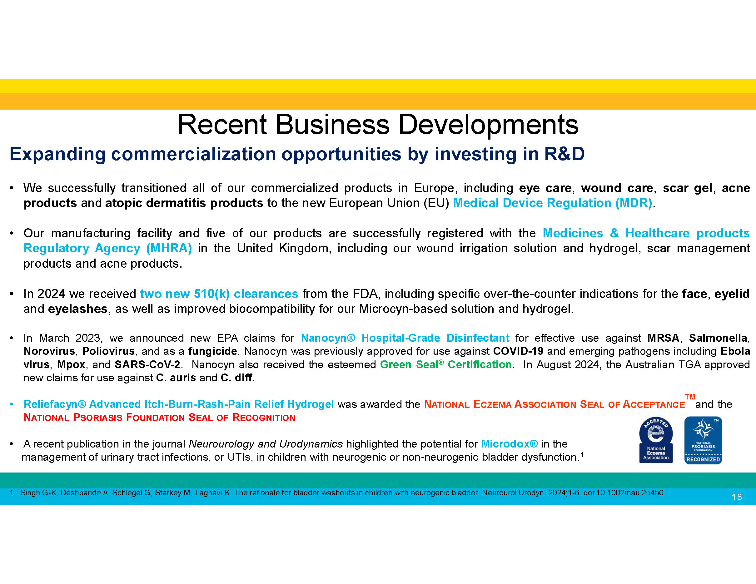 Expanding commercialization opportunities by investing in R&D • We successfully transitioned all of our commercialized products in Europe, including eye care , wound care , scar gel , acne products and atopic dermatitis products to the new European Union (EU) Medical Device Regulation (MDR) . • Our manufacturing facility and five of our products are successfully registered with the Medicines & Healthcare products Regulatory Agency (MHRA) in the United Kingdom, including our wound irrigation solution and hydrogel, scar management products and acne products . • In 2024 we received two new 510(k) clearances from the FDA, including specific over - the - counter indications for the face , eyelid and eyelashes , as well as improved biocompatibility for our Microcyn - based solution and hydrogel. • In March 2023 , we announced new EPA claims for Nanocyn® Hospital - Grade Disinfectant for effective use against MRSA , Salmonella , Norovirus , Poliovirus , and as a fungicide . Nanocyn was previously approved for use against COVID - 19 and emerging pathogens including Ebola virus , Mpox , and SARS - CoV - 2 . Nanocyn also received the esteemed Green Seal ® Certification . In August 2024 , the Australian TGA approved new claims for use against C . auris and C . diff . TM • Reliefacyn® Advanced Itch - Burn - Rash - Pain Relief Hydrogel was awarded the N ATIONAL E CZEMA A SSOCIATION S EAL OF A CCEPTANCE and the N ATIONAL P SORIASIS F OUNDATION S EAL OF R ECOGNITION • A recent publication in the journal Neurourology and Urodynamics highlighted the potential for Microdox® in the management of urinary tract infections, or UTIs, in children with neurogenic or non - neurogenic bladder dysfunction. 1 1. Singh G - K, Deshpande A, Schlegel G, Starkey M, Taghavi K. The rationale for bladder washouts in children with neurogenic bladder. Neurourol Urodyn. 2024;1 - 6. doi:10.1002/nau.25450 Recent Business Developments 18