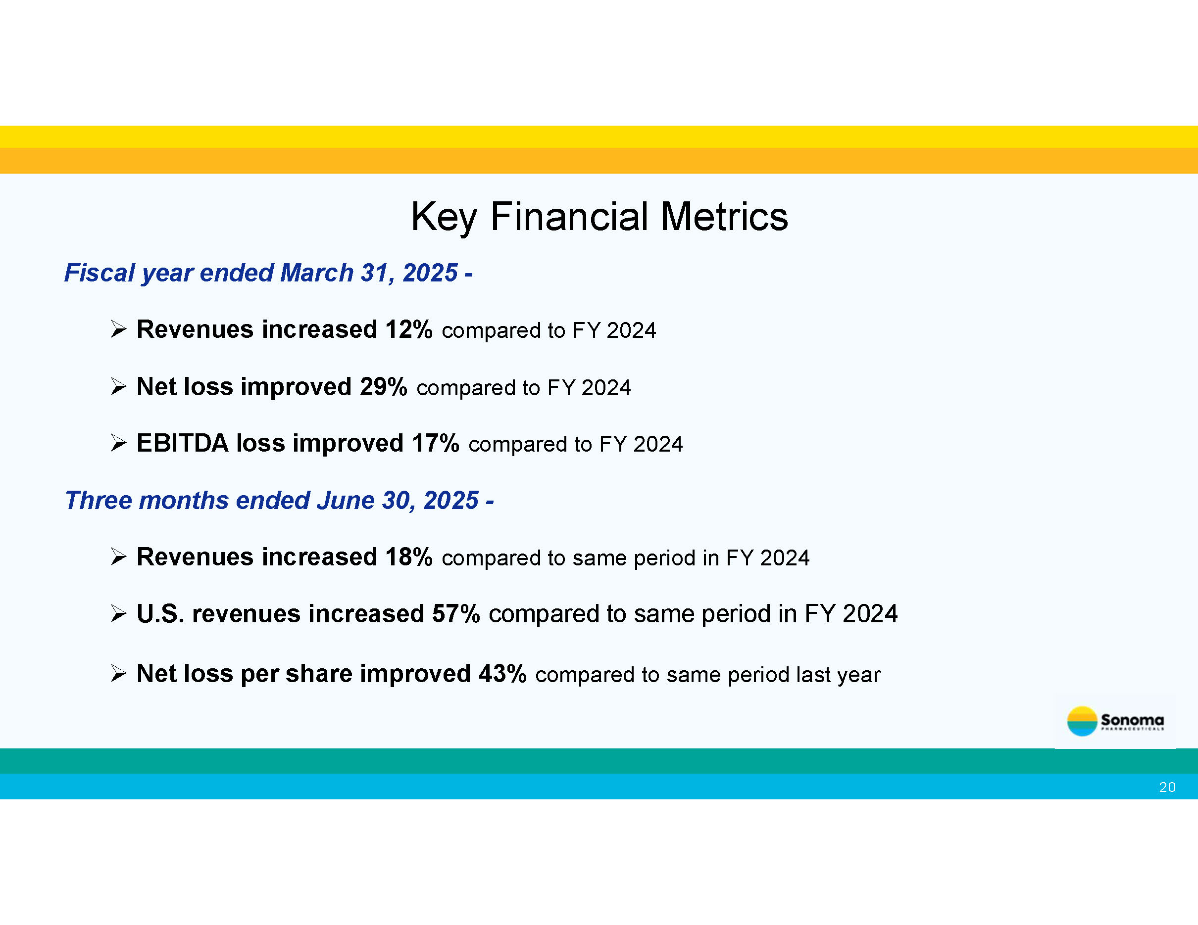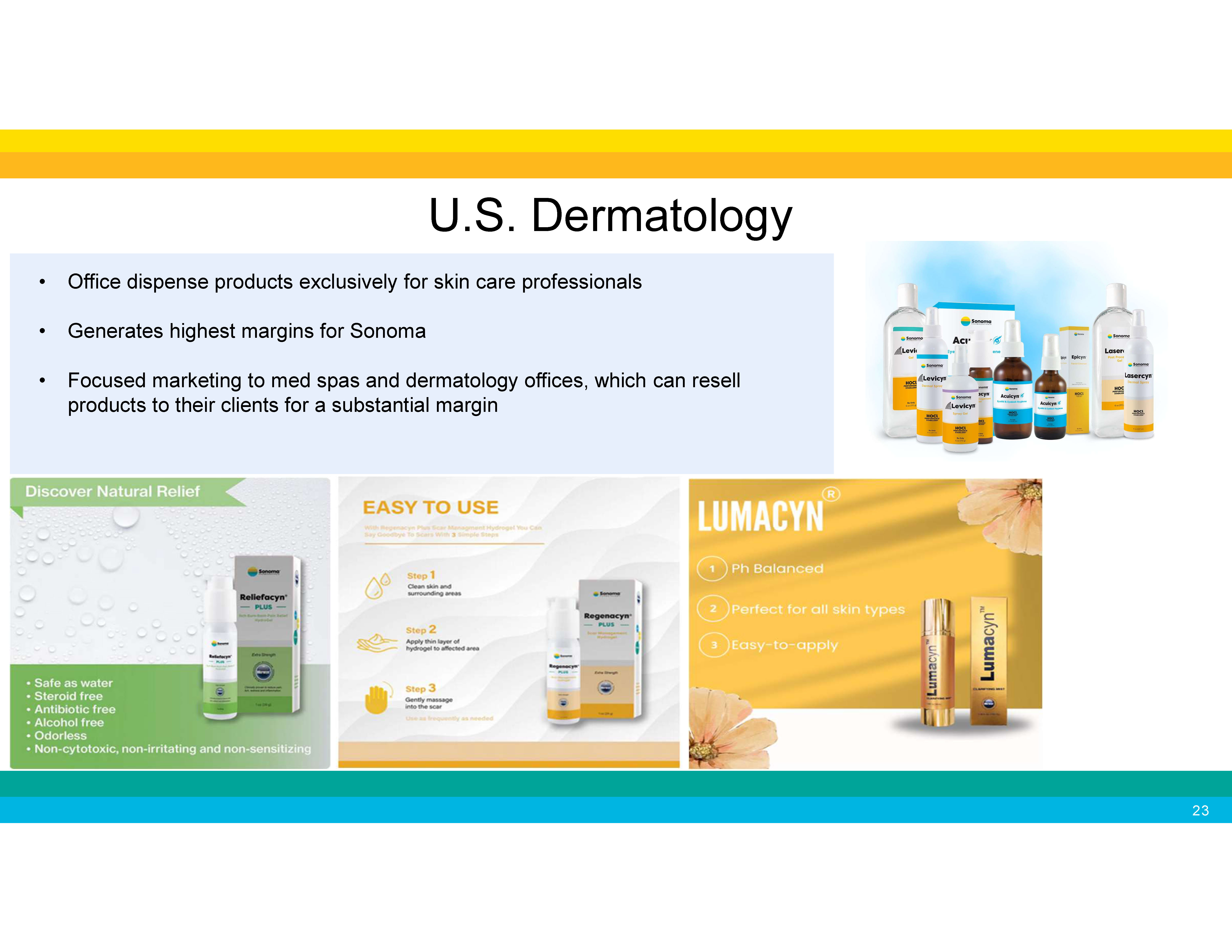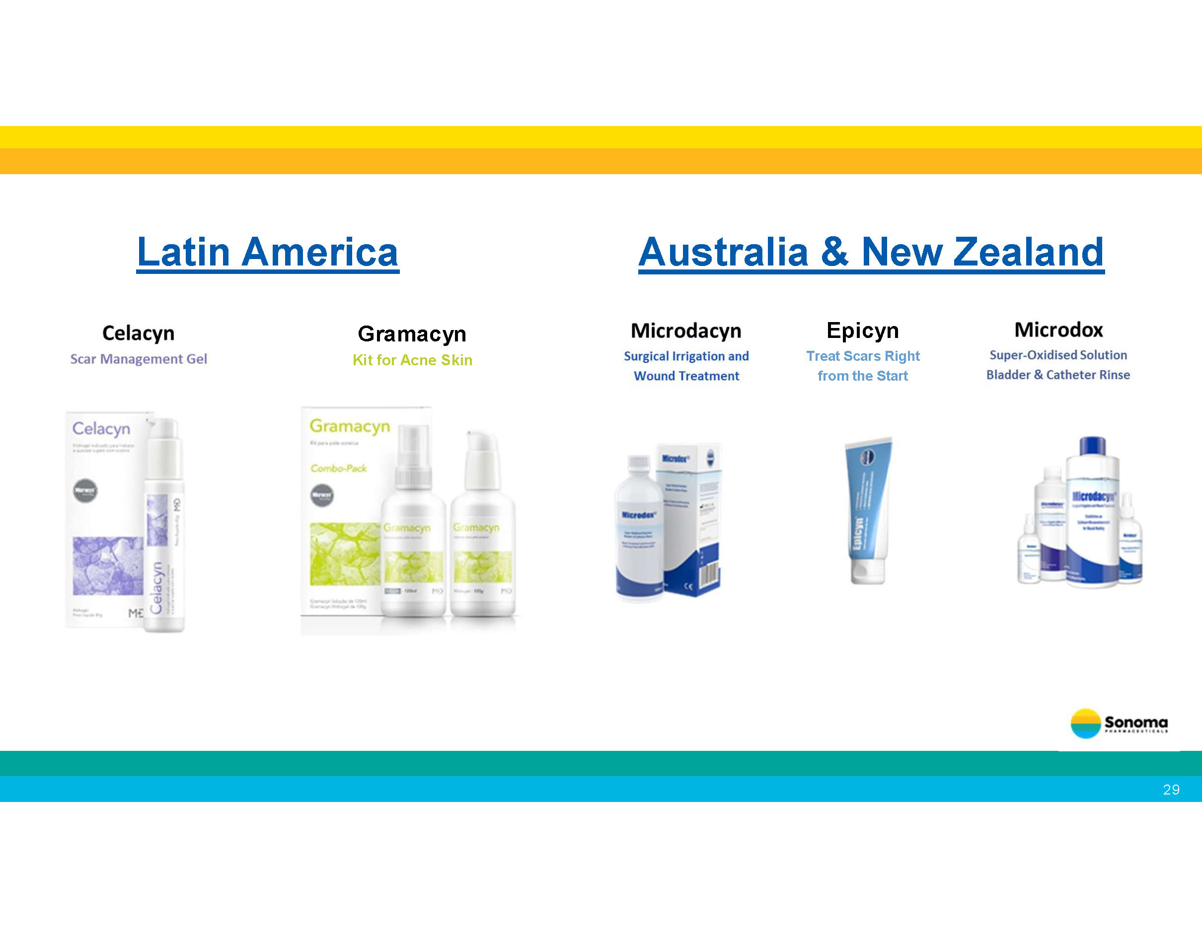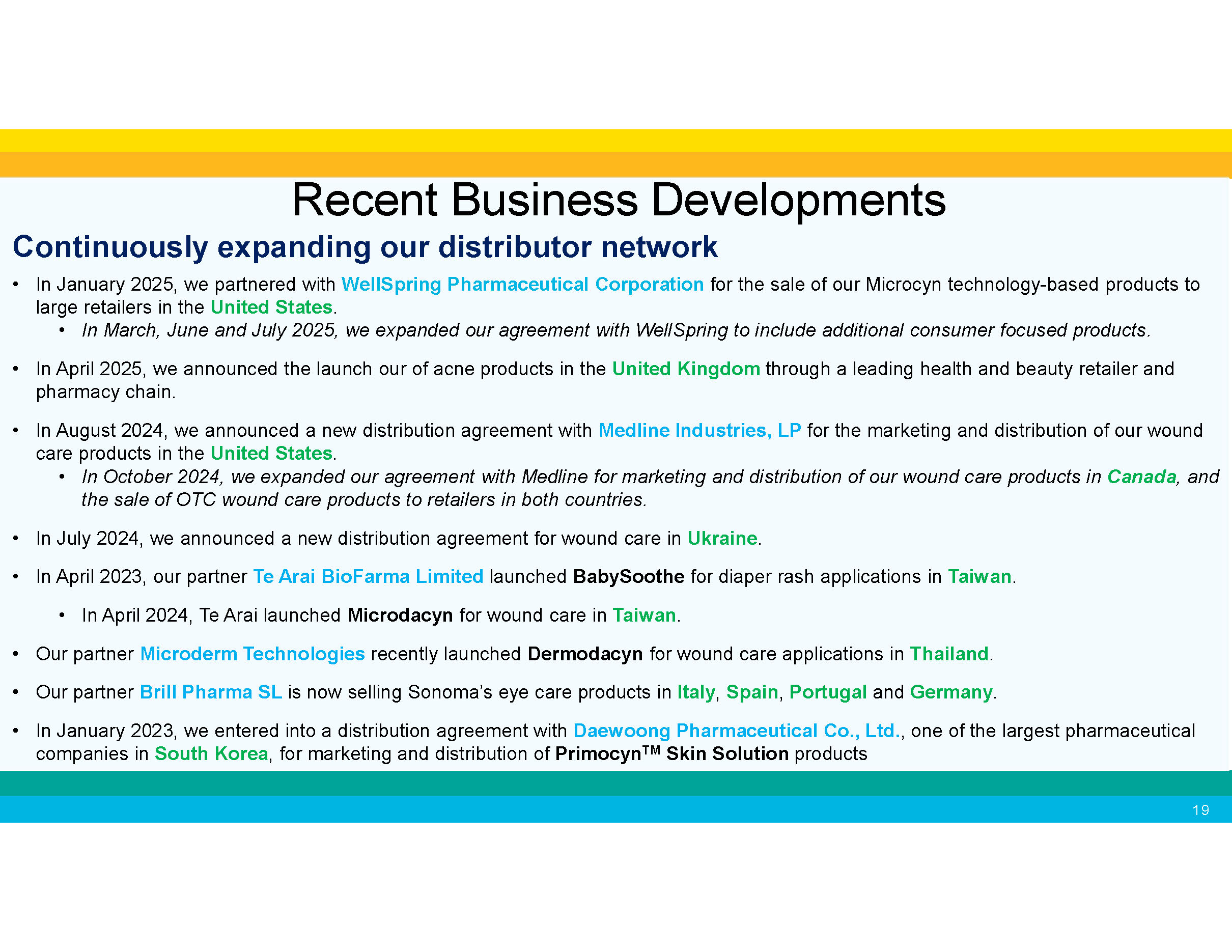 Continuously expanding our distributor network 19 • In January 2025, we partnered with WellSpring Pharmaceutical Corporation for the sale of our Microcyn technology - based products to large retailers in the United States . • In March, June and July 2025, we expanded our agreement with WellSpring to include additional consumer focused products. • In April 2025, we announced the launch our of acne products in the United Kingdom through a leading health and beauty retailer and pharmacy chain. • In August 2024, we announced a new distribution agreement with Medline Industries, LP for the marketing and distribution of our wound care products in the United States . • In October 2024, we expanded our agreement with Medline for marketing and distribution of our wound care products in Canada , and the sale of OTC wound care products to retailers in both countries. • In July 2024, we announced a new distribution agreement for wound care in Ukraine . • In April 2023, our partner Te Arai BioFarma Limited launched BabySoothe for diaper rash applications in Taiwan . • In April 2024, Te Arai launched Microdacyn for wound care in Taiwan . • Our partner Microderm Technologies recently launched Dermodacyn for wound care applications in Thailand . • Our partner Brill Pharma SL is now selling Sonoma’s eye care products in Italy , Spain , Portugal and Germany . • In January 2023, we entered into a distribution agreement with Daewoong Pharmaceutical Co., Ltd. , one of the largest pharmaceutical companies in South Korea , for marketing and distribution of Primocyn TM Skin Solution products Recent Business Developments