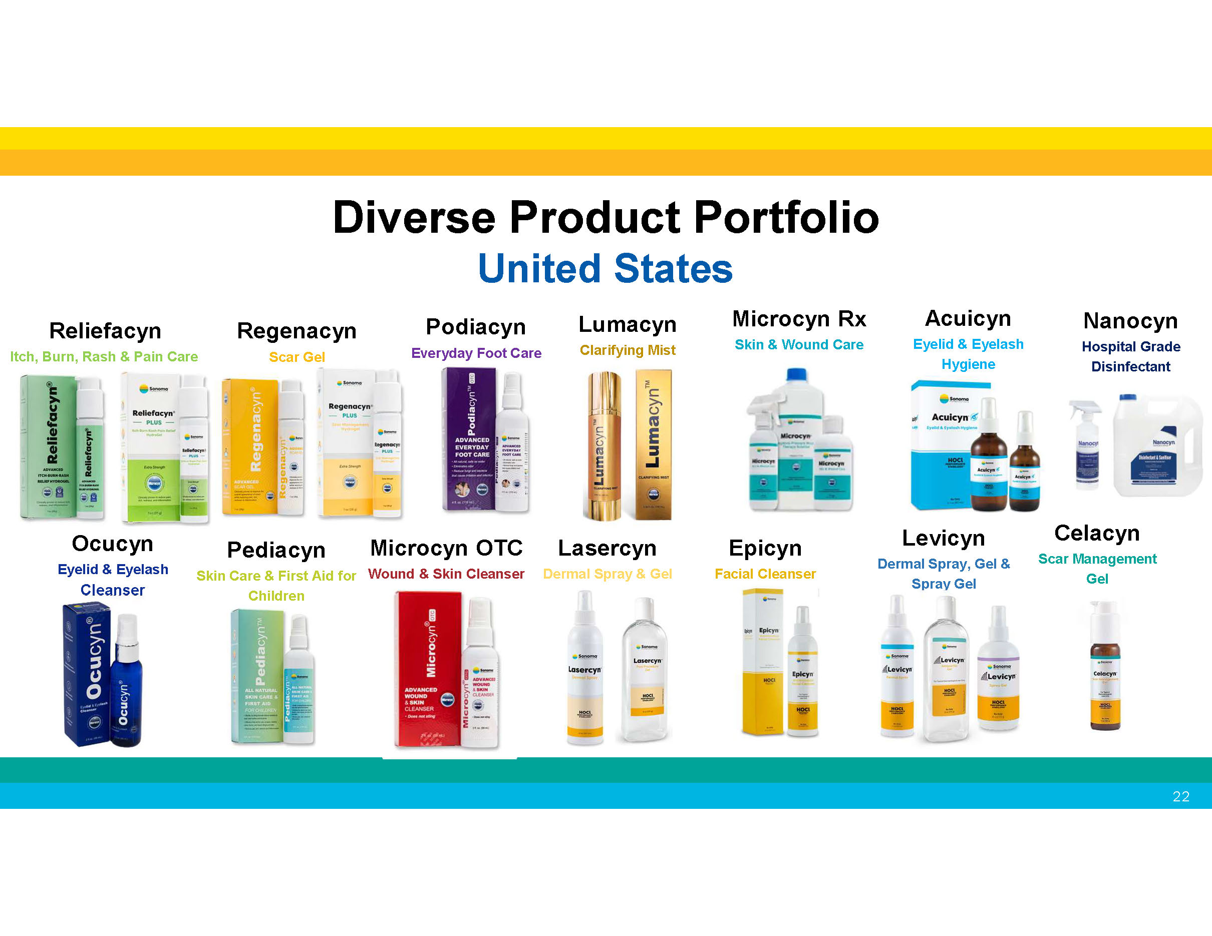 Diverse Product Portfolio United States Lumacyn Clarifying Mist Microcyn Rx Skin & Wound Care Regenacyn Scar Gel Epicyn Facial Cleanser Nanocyn Hospital Grade Disinfectant Levicyn Dermal Spray, Gel & Spray Gel Celacyn Scar Management Gel Reliefacyn Itch, Burn, Rash & Pain Care Ocucyn Eyelid & Eyelash Cleanser Pediacyn Skin Care & First Aid for Children Acuicyn Eyelid & Eyelash Hygiene Podiacyn Everyday Foot Care Microcyn OTC Lasercyn Wound & Skin Cleanser Dermal Spray & Gel 22
