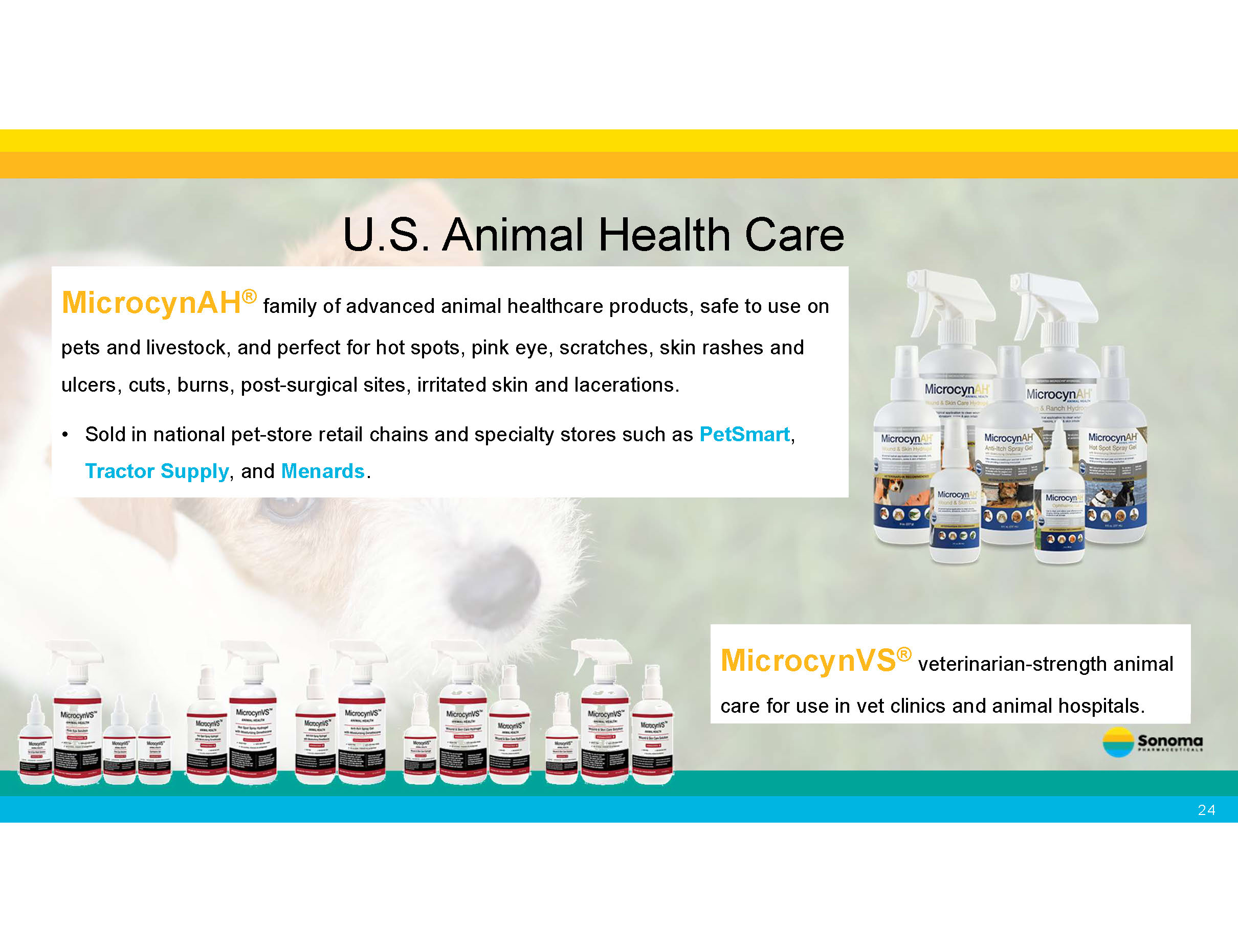 U.S. Animal Health Care MicrocynAH ® family of advanced animal healthcare products, safe to use on pets and livestock, and perfect for hot spots, pink eye, scratches, skin rashes and ulcers, cuts, burns, post - surgical sites, irritated skin and lacerations. • Sold in national pet - store retail chains and specialty stores such as PetSmart , Tractor Supply , and Menards . MicrocynVS ® veterinarian - strength animal care for use in vet clinics and animal hospitals. 24