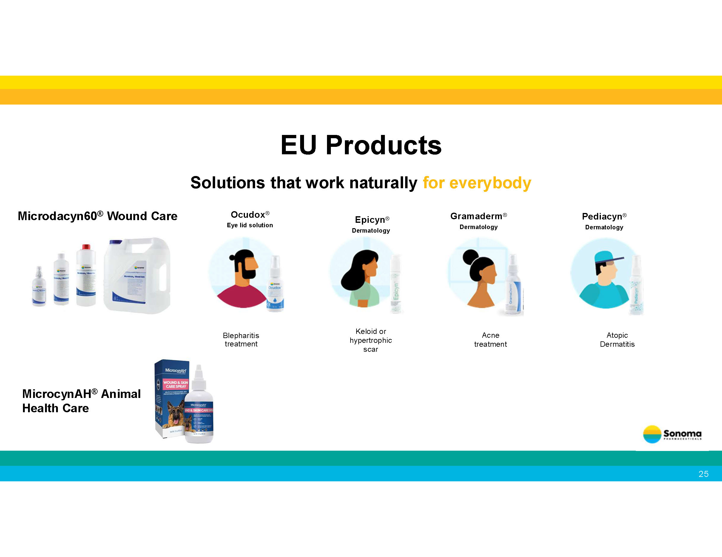Epicyn ® Dermatology Gramaderm ® Dermatology Pediacyn ® Dermatology Blepharitis treatment Ocudox ® Eye lid solution Keloid or hypertrophic scar Acne treatment Atopic Dermatitis Solutions that work naturally for everybody EU Products Microdacyn60 ® Wound Care MicrocynAH ® Animal Health Care 25
