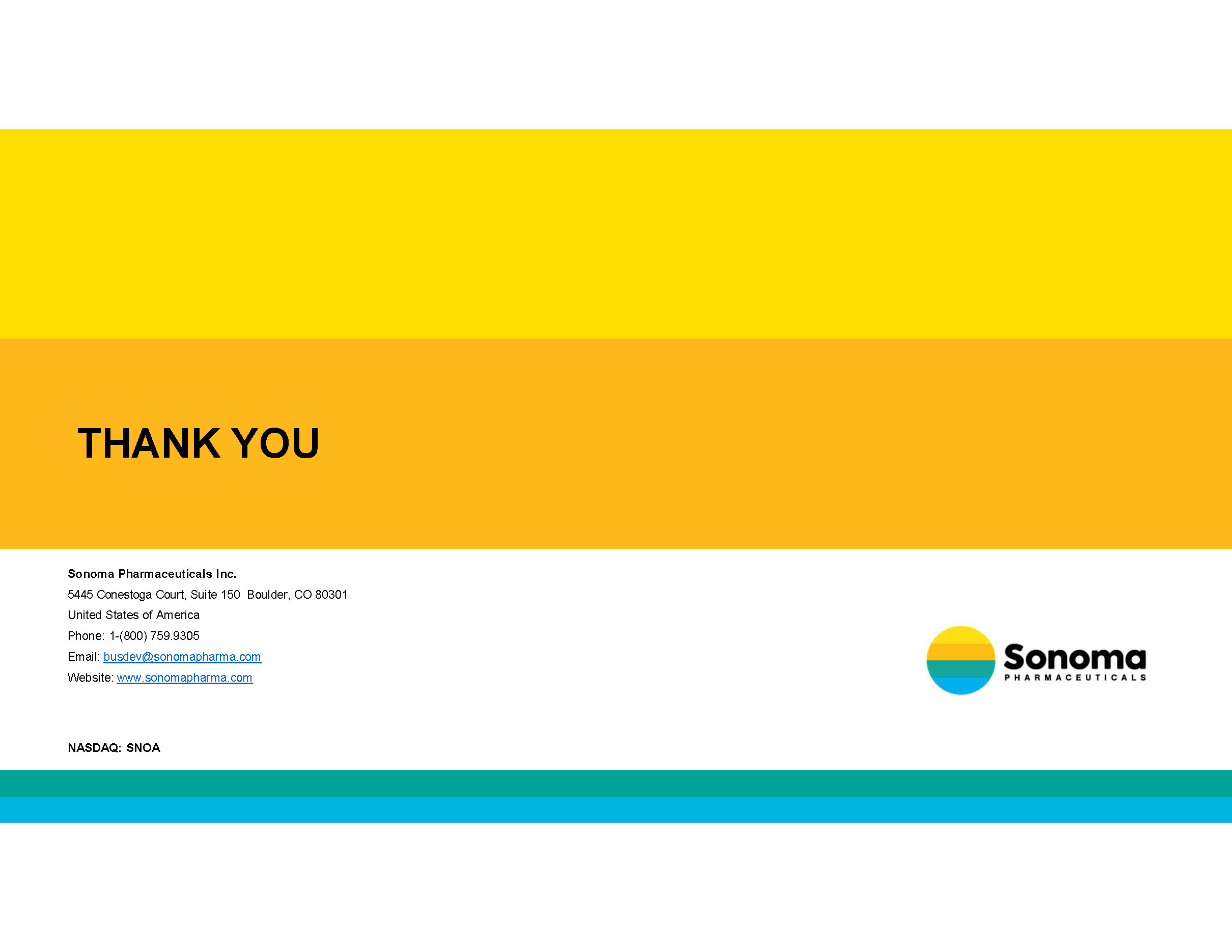 THANK YOU Sonoma Pharmaceuticals Inc. 5445 Conestoga Court, Suite 150 Boulder, CO 80301 United States of America Phone: 1 - (800) 759.9305 Email: busdev@sonomapharma.com Website: www.sonomapharma.com NASDAQ: SNOA