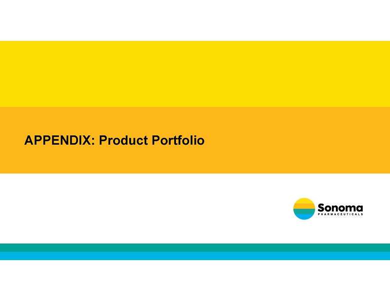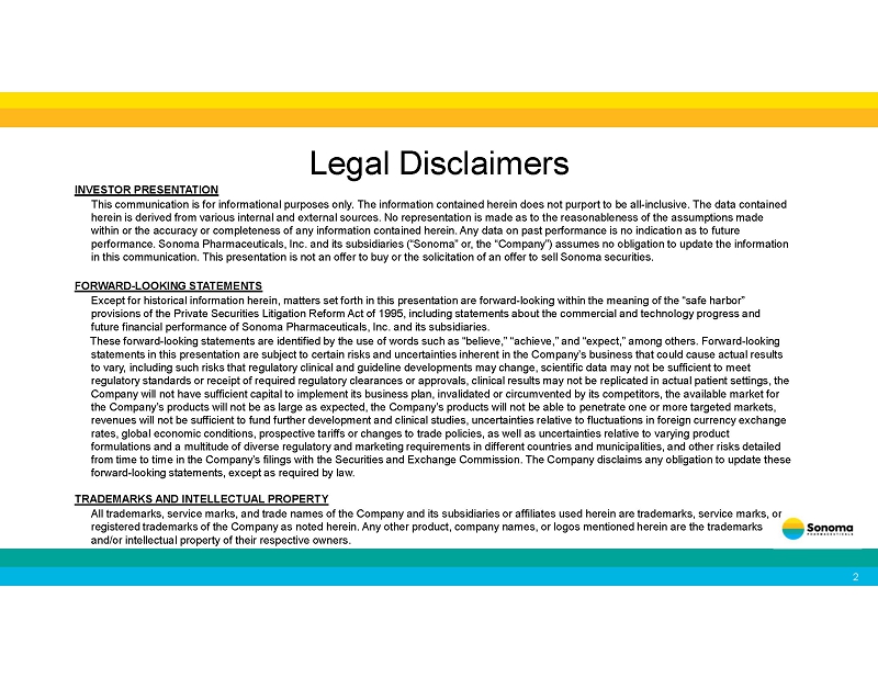 Legal Disclaimers r INVESTOR PRESENTATION This communication is for informational purposes only. The information contained herein does not purport to be all - inclusive. The data contained herein is derived from various internal and external sources. No representation is made as to the reasonableness of the assumptions made within or the accuracy or completeness of any information contained herein. Any data on past performance is no indication as to future performance. Sonoma Pharmaceuticals, Inc. and its subsidiaries (“Sonoma” or, the “Company”) assumes no obligation to update the information in this communication. This presentation is not an offer to buy or the solicitation of an offer to sell Sonoma securities. FORWARD - LOOKING STATEMENTS Except for historical information herein, matters set forth in this presentation are forward - looking within the meaning of the “safe harbor” provisions of the Private Securities Litigation Reform Act of 1995, including statements about the commercial and technology progress and future financial performance of Sonoma Pharmaceuticals, Inc. and its subsidiaries. These forward - looking statements are identified by the use of words such as “believe,” “achieve,” and “expect,” among others. Forward - looking statements in this presentation are subject to certain risks and uncertainties inherent in the Company’s business that could cause actual results to vary, including such risks that regulatory clinical and guideline developments may change, scientific data may not be sufficient to meet regulatory standards or receipt of required regulatory clearances or approvals, clinical results may not be replicated in actual patient settings, the Company will not have sufficient capital to implement its business plan, invalidated or circumvented by its competitors, the available market for the Company’s products will not be as large as expected, the Company’s products will not be able to penetrate one or more targeted markets, revenues will not be sufficient to fund further development and clinical studies, uncertainties relative to fluctuations in foreign currency exchange rates, global economic conditions, prospective tariffs or changes to trade policies, as well as uncertainties relative to varying product formulations and a multitude of diverse regulatory and marketing requirements in different countries and municipalities, and other risks detailed from time to time in the Company’s filings with the Securities and Exchange Commission. The Company disclaims any obligation to update these forward - looking statements, except as required by law. TRADEMARKS AND INTELLECTUAL PROPERTY All trademarks, service marks, and trade names of the Company and its subsidiaries or affiliates used herein are trademarks, service marks, o r egistered trademarks of the Company as noted herein. Any other product, company names, or logos mentioned herein are the trademarks and/or intellectual property of their respective owners.