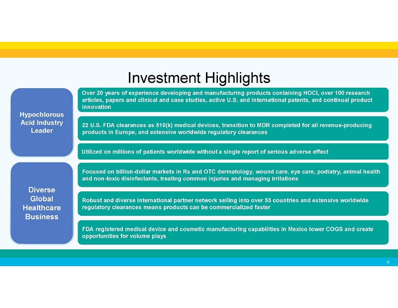 H y po c h l o r ou s Acid Industry Leader H y po c h l o r ou s Acid Industry Leader 22 U.S. FDA clearances as 510(k) medical devices, transition to MDR completed for all revenue - producing products in Europe, and extensive worldwide regulatory clearances Utilized on millions of patients worldwide without a single report of serious adverse effect Focused on billion - dollar markets in Rx and OTC dermatology, wound care, eye care, podiatry, animal health and non - toxic disinfectants, treating common injuries and managing irritations Diverse Global H e a l t h c a r e Business Diverse Global H e a l t h c a r e Business Investment Highlights Over 20 years of experience developing and manufacturing products containing HOCl, over 100 research articles, papers and clinical and case studies, active U.S. and international patents, and continual product innovation Robust and diverse international partner network selling into over 55 countries and extensive worldwide regulatory clearances means products can be commercialized faster FDA registered medical device and cosmetic manufacturing capabilities in Mexico lower COGS and create opportunities for volume plays