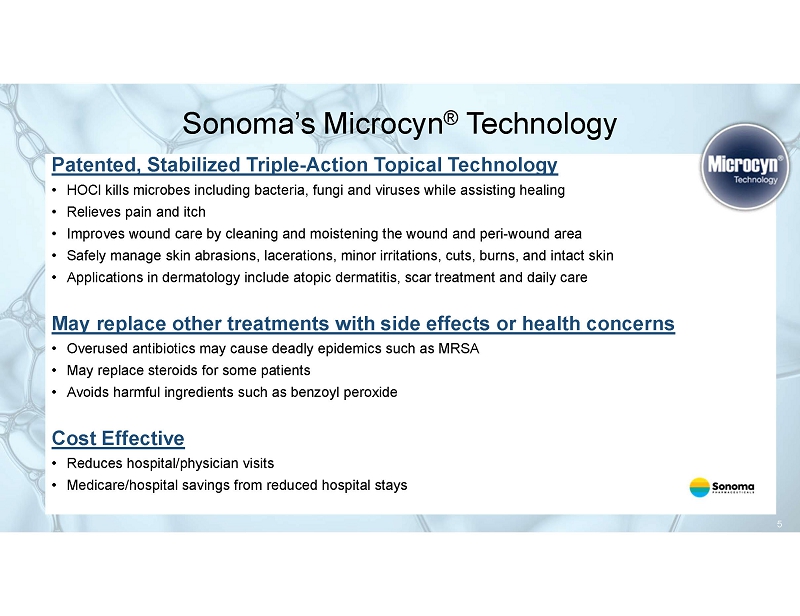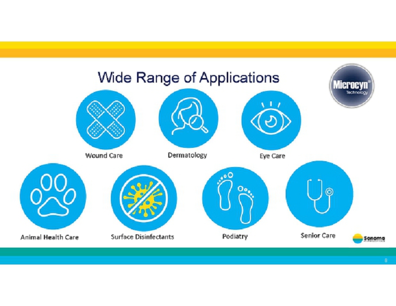 About Sonoma Sonoma Pharmaceuticals is a global healthcare leader for developing and producing stabilized hypochlorous acid (HOCl) products for a wide range of applications, including wound care, eye care, dermatological conditions, podiatry, animal health care and non - toxic disinfectants. Sonoma’s products are clinically proven to reduce itch, pain, scarring, and irritation safely and without damaging healthy tissue. In - vitro and clinical studies of HOCl show it to safely manage skin abrasions, lacerations, minor irritations, cuts, and intact skin. Sonoma’s products are sold either directly or via partners in over 55 countries worldwide. Sonoma actively seeks new distribution partners.