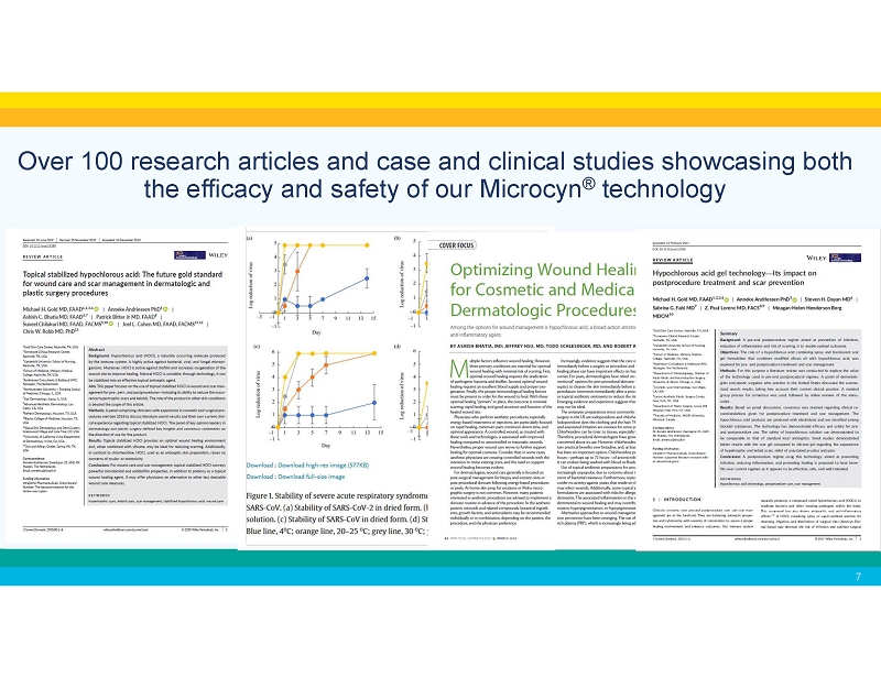 Sonoma’s Microcyn ® Technology Unparalleled Safety • No drug - to - drug interaction or contraindications • Millions of patients treated worldwide without a single report of serious adverse effect • 30+ human clinical trials with over 1,500 patients • Products contain all - natural hypochlorous acid Industry Leader • Strong U.S. and international regulatory portfolio • Longer shelf life than most competitors while retaining efficacy • Available in solution, hydrogel and in combination with silicone for scar treatment • White label available with custom packaging and design • Established Microcyn ® brand • State of the art manufacturing 6