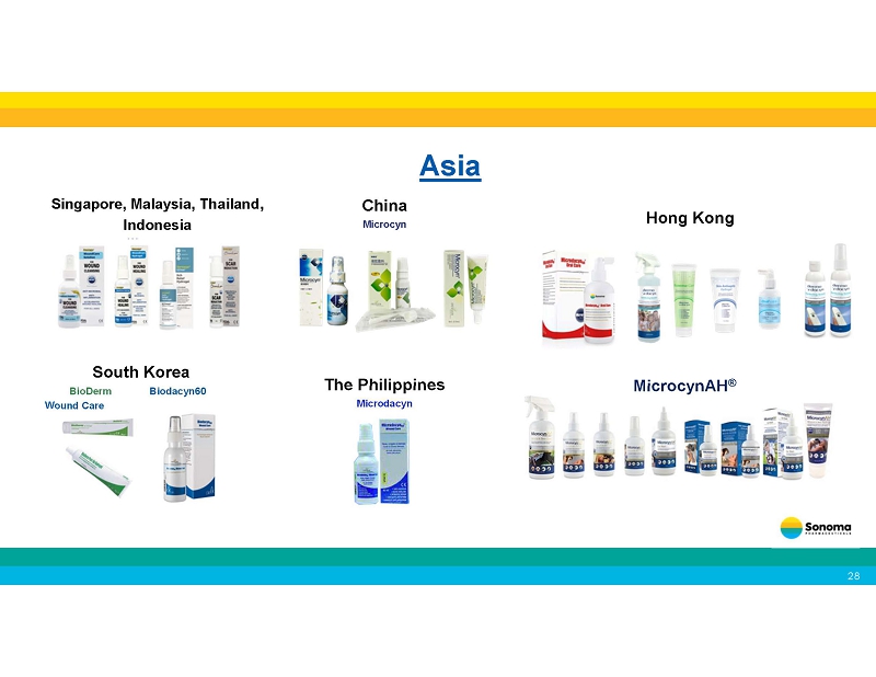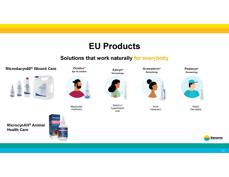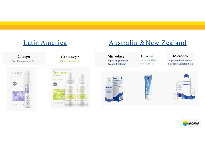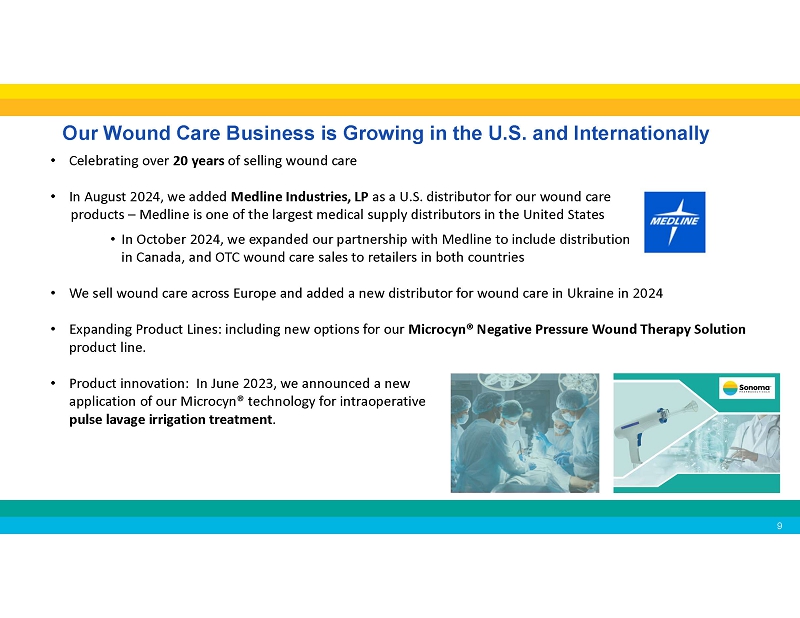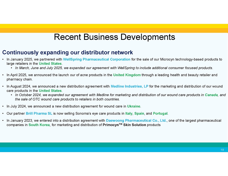 Continuously expanding our distributor network • In January 2025, we partnered with WellSpring Pharmaceutical Corporation for the sale of our Microcyn technology - based products to large retailers in the United States . • In March, June and July 2025, we expanded our agreement with WellSpring to include additional consumer focused products. • In April 2025, we announced the launch our of acne products in the United Kingdom through a leading health and beauty retailer and pharmacy chain. • In August 2024, we announced a new distribution agreement with Medline Industries, LP for the marketing and distribution of our wound care products in the United States . • In October 2024, we expanded our agreement with Medline for marketing and distribution of our wound care products in Canada , and the sale of OTC wound care products to retailers in both countries. • In July 2024, we announced a new distribution agreement for wound care in Ukraine . • Our partner Brill Pharma SL is now selling Sonoma’s eye care products in Italy , Spain , and Portugal . • In January 2023, we entered into a distribution agreement with Daewoong Pharmaceutical Co., Ltd. , one of the largest pharmaceutical companies in South Korea , for marketing and distribution of Primocyn TM Skin Solution products Recent Business Developments