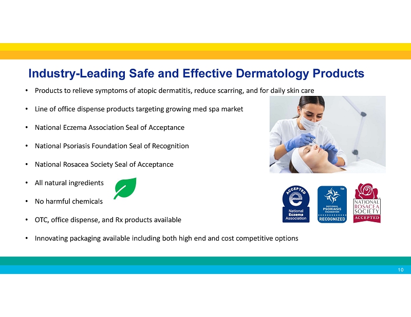 Industry - Leading Safe and Effective Dermatology Products • Products to relieve symptoms of atopic dermatitis, reduce scarring, and for daily skin care • Line of office dispense products targeting growing med spa market • National Eczema Association Seal of Acceptance • National Psoriasis Foundation Seal of Recognition • National Rosacea Society Seal of Acceptance • All natural ingredients • No harmful chemicals • OTC, office dispense, and Rx products available • Innovating packaging available including both high end and cost competitive options
