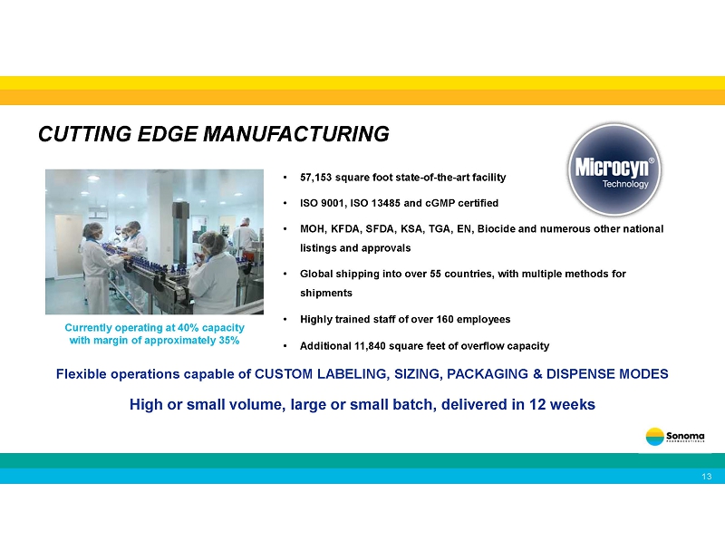 • 57,153 square foot state - of - the - art facility • ISO 9001, ISO 13485 and cGMP certified • MOH, KFDA, SFDA, KSA, TGA, EN, Biocide and numerous other national listings and approvals • Global shipping into over 55 countries, with multiple methods for shipments • Highly trained staff of over 160 employees • Additional 11,840 square feet of overflow capacity CUTTING EDGE MANUFACTURING Flexible operations capable of CUSTOM LABELING, SIZING, PACKAGING & DISPENSE MODES High or small volume, large or small batch, delivered in 12 weeks Currently operating at 40% capacity with margin of approximately 35%