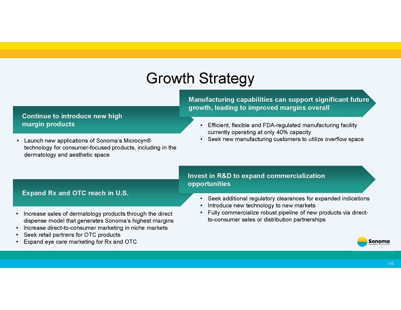U.S. Dermatology • Office dispense products exclusively for skin care professionals • Generates highest margins for Sonoma • Focused marketing to med spas and dermatology offices, which can resell products to their clients for a substantial margin