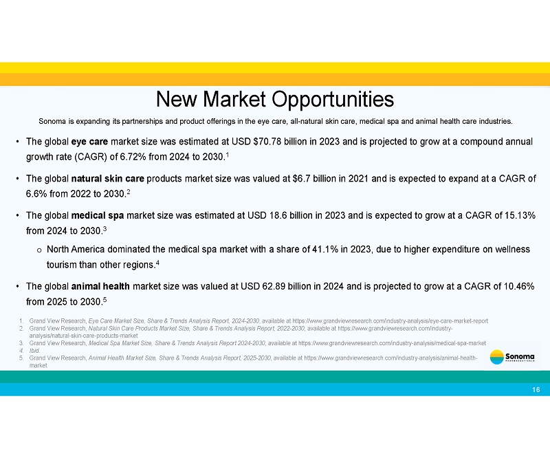 Sonoma is expanding its partnerships and product offerings in the eye care, all - natural skin care, medical spa and animal health care industries. • The global eye care market size was estimated at USD $70.78 billion in 2023 and is projected to grow at a compound annual growth rate (CAGR) of 6.72% from 2024 to 2030. 1 • The global natural skin care products market size was valued at $6.7 billion in 2021 and is expected to expand at a CAGR of 6.6% from 2022 to 2030. 2 • The global medical spa market size was estimated at USD 18.6 billion in 2023 and is expected to grow at a CAGR of 15.13% from 2024 to 2030. 3 o North America dominated the medical spa market with a share of 41.1% in 2023, due to higher expenditure on wellness tourism than other regions. 4 • The global animal health market size was valued at USD 62.89 billion in 2024 and is projected to grow at a CAGR of 10.46% from 2025 to 2030. 5 New Market Opportunities 1. Grand View Research, Eye Care Market Size, Share & Trends Analysis Report, 2024 - 2030, available at https:// www.grandviewresearch.com/industry - analysis/eye - care - market - report 2. Grand View Research, Natural Skin Care Products Market Size, Share & Trends Analysis Report, 2022 - 2030, available at https:// www.grandviewresearch.com/industry - analysis/natural - skin - care - products - market 3. Grand View Research, Medical Spa Market Size, Share & Trends Analysis Report 2024 - 2030, available at https:// www.grandviewresearch.com/industry - analysis/medical - spa - market 4. Ibid. 5. Grand View Research, Animal Health Market Size, Share & Trends Analysis Report, 2025 - 2030, available at https:// www.grandviewresearch.com/industry - analysis/animal - health - market 1 6