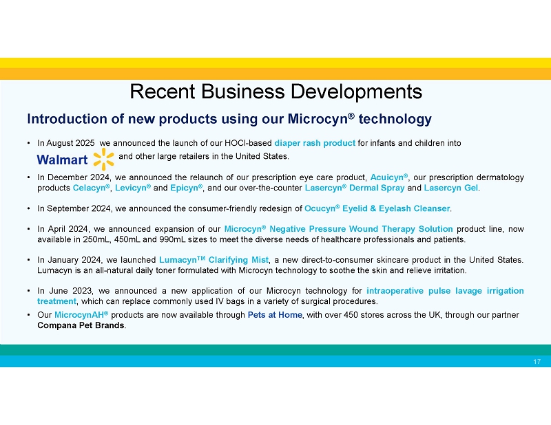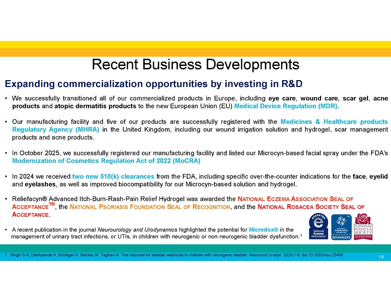 Expanding commercialization opportunities by investing in R&D • We successfully transitioned all of our commercialized products in Europe, including eye care, wound care, scar gel, acne products and atopic dermatitis products to the new European Union (EU) Medical Device Regulation (MDR) . • Our manufacturing facility and five of our products are successfully registered with the Medicines & Healthcare products Regulatory Agency (MHRA) in the United Kingdom, including our wound irrigation solution and hydrogel, scar management products and acne products . • In October 2025, we successfully registered our manufacturing facility and listed our Microcyn - based facial spray under the FDA's Modernization of Cosmetics Regulation Act of 2022 (MoCRA) • In 2024 we received two new 510(k) clearances from the FDA, including specific over - the - counter indications for the face, eyelid and eyelashes, as well as improved biocompatibility for our Microcyn - based solution and hydrogel. • Reliefacyn® Advanced Itch - Burn - Rash - Pain Relief Hydrogel was awarded the N ATIONAL E CZEMA A SSOCIATION S EAL OF A CCEPTANCE TM , the N ATIONAL P SORIASIS F OUNDATION S EAL OF R ECOGNITION , and the N ATIONAL R OSACEA S OCIETY S EAL OF A CCEPTANCE . • A recent publication in the journal Neurourology and Urodynamics highlighted the potential for Microdox® in the management of urinary tract infections, or UTIs, in children with neurogenic or non-neurogenic bladder dysfunction. 1 1. Singh G-K, Deshpande A, Schlegel G, Starkey M, Taghavi K. The rationale for bladder washouts in children with neurogenic bladder. Neurourol Urodyn. 2024;1-6. doi:10.1002/nau.25450 Recent Business Developments
