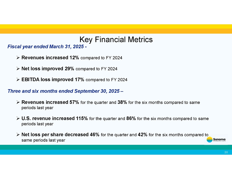 Key Financial Metrics 2 0 Fiscal year ended March 31, 2025 - □ Revenues increased 12% compared to FY 2024 □ Net loss improved 29% compared to FY 2024 □ EBITDA loss improved 17% compared to FY 2024 Three and six months ended September 30, 2025 – □ Revenues increased 57% for the quarter and 38% for the six months compared to same periods last year □ U.S. revenue increased 115% for the quarter and 86% for the six months compared to same periods last year □ Net loss per share decreased 46% for the quarter and 42% for the six months compared to same periods last year