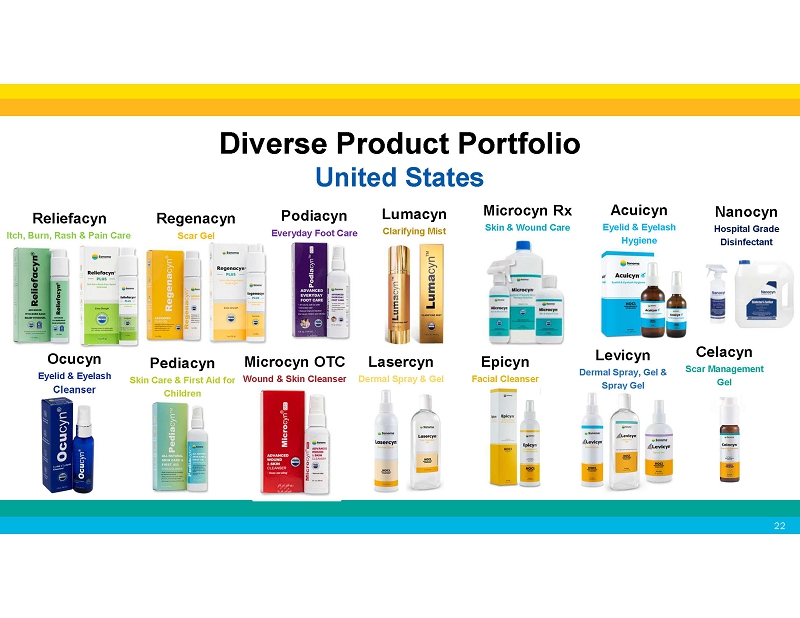 Diverse Product Portfolio United States L u m ac y n Clarifying Mist Microcyn Rx Skin & Wound Care R e g e n ac y n Scar Gel Epicyn Facial Cleanser Nanocyn Hospital Grade Disinfectant Levicyn Dermal Spray, Gel & Spray Gel Celacyn Scar Management Gel Reliefacyn Itch, Burn, Rash & Pain Care Ocucyn Eyelid & Eyelash Cleanser Pediacyn Skin Care & First Aid for Children Acuicyn Eyelid & Eyelash Hygiene Podiacyn Everyday Foot Care Microcyn OTC Lasercyn Wound & Skin Cleanser Dermal Spray & Gel