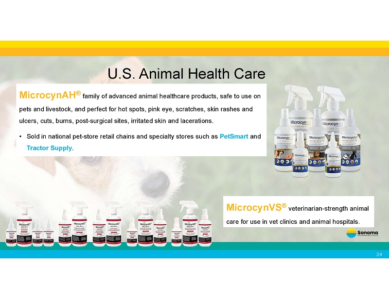 U.S. Animal Health Care MicrocynAH ® family of advanced animal healthcare products, safe to use on pets and livestock, and perfect for hot spots, pink eye, scratches, skin rashes and ulcers, cuts, burns, post - surgical sites, irritated skin and lacerations. • Sold in national pet - store retail chains and specialty stores such as PetSmart and Tractor Supply . MicrocynVS ® veterinarian - strength animal care for use in vet clinics and animal hospitals. 2 4