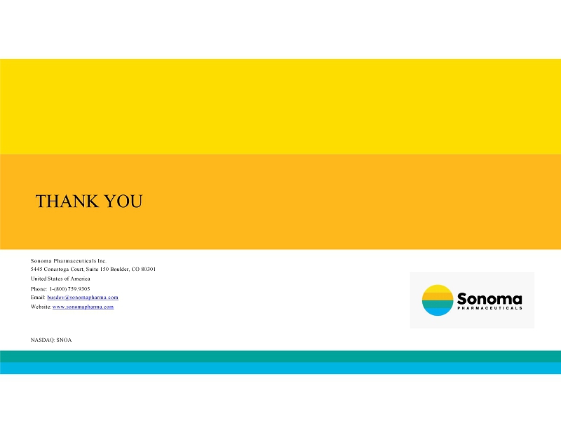 THANK YOU Sonoma Pharmaceuticals Inc. 5445 Conestoga Court, Suite 150 Boulder, CO 80301 United States of America Phone: 1 - (800) 759.9305 Email: busdev@sonomapharma.com Website: www.sonomapharma.com NASDAQ: SNOA