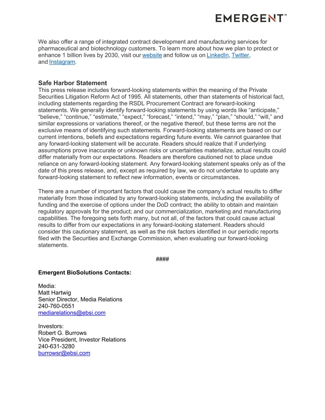 We also offer a range of integrated contract development and manufacturing services for pharmaceutical and biotechnology customers. To learn more about how we plan to protect or enhance 1 billion lives by 2030, visit our website and follow us on LinkedIn, Twitter, and Instagram. Safe Harbor Statement This press release includes forward-looking statements within the meaning of the Private Securities Litigation Reform Act of 1995. All statements, other than statements of historical fact, including statements regarding the RSDL Procurement Contract are forward-looking statements. We generally identify forward-looking statements by using words like “anticipate,” “believe,” “continue,” “estimate,” “expect,” “forecast,” “intend,” “may,” “plan,” “should,” “will,” and similar expressions or variations thereof, or the negative thereof, but these terms are not the exclusive means of identifying such statements. Forward-looking statements are based on our current intentions, beliefs and expectations regarding future events. We cannot guarantee that any forward-looking statement will be accurate. Readers should realize that if underlying assumptions prove inaccurate or unknown risks or uncertainties materialize, actual results could differ materially from our expectations. Readers are therefore cautioned not to place undue reliance on any forward-looking statement. Any forward-looking statement speaks only as of the date of this press release, and, except as required by law, we do not undertake to update any forward-looking statement to reflect new information, events or circumstances. There are a number of important factors that could cause the company’s actual results to differ materially from those indicated by any forward-looking statements, including the availability of funding and the exercise of options under the DoD contract; the ability to obtain and maintain regulatory approvals for the product; and our commercialization, marketing and manufacturing capabilities. The foregoing sets forth many, but not all, of the factors that could cause actual results to differ from our expectations in any forward-looking statement. Readers should consider this cautionary statement, as well as the risk factors identified in our periodic reports filed with the Securities and Exchange Commission, when evaluating our forward-looking statements. #### Emergent BioSolutions Contacts: Media: Matt Hartwig Senior Director, Media Relations 240-760-0551 mediarelations@ebsi.com Investors: Robert G. Burrows Vice President, Investor Relations 240-631-3280 burrowsr@ebsi.com