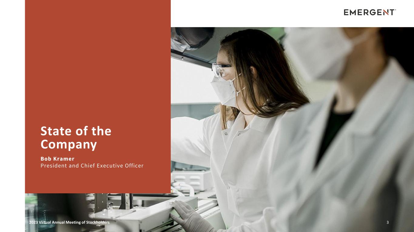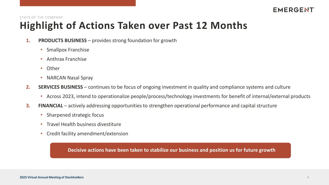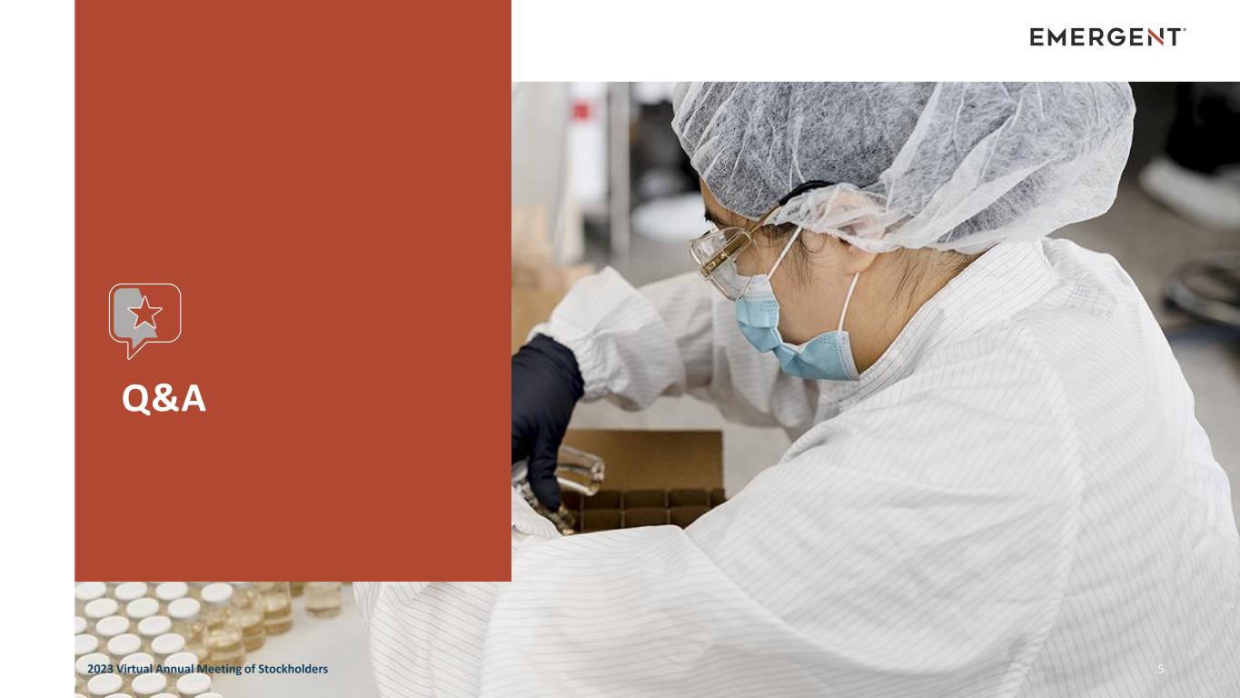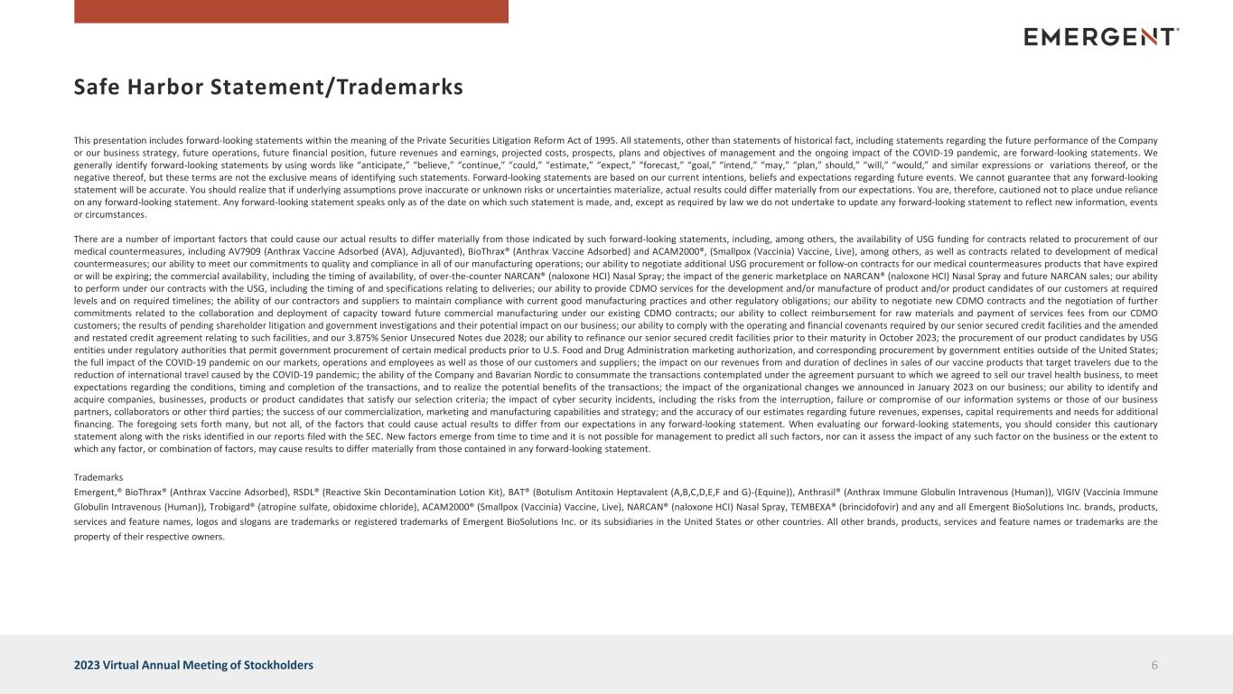 Safe Harbor Statement/Trademarks 62023 Virtual Annual Meeting of Stockholders This presentation includes forward-looking statements within the meaning of the Private Securities Litigation Reform Act of 1995. All statements, other than statements of historical fact, including statements regarding the future performance of the Company or our business strategy, future operations, future financial position, future revenues and earnings, projected costs, prospects, plans and objectives of management and the ongoing impact of the COVID-19 pandemic, are forward-looking statements. We generally identify forward-looking statements by using words like “anticipate,” “believe,” “continue,” “could,” “estimate,” “expect,” “forecast,” “goal,” “intend,” “may,” “plan,” should,” “will,” “would,” and similar expressions or variations thereof, or the negative thereof, but these terms are not the exclusive means of identifying such statements. Forward-looking statements are based on our current intentions, beliefs and expectations regarding future events. We cannot guarantee that any forward-looking statement will be accurate. You should realize that if underlying assumptions prove inaccurate or unknown risks or uncertainties materialize, actual results could differ materially from our expectations. You are, therefore, cautioned not to place undue reliance on any forward-looking statement. Any forward-looking statement speaks only as of the date on which such statement is made, and, except as required by law we do not undertake to update any forward-looking statement to reflect new information, events or circumstances. There are a number of important factors that could cause our actual results to differ materially from those indicated by such forward-looking statements, including, among others, the availability of USG funding for contracts related to procurement of our medical countermeasures, including AV7909 (Anthrax Vaccine Adsorbed (AVA), Adjuvanted), BioThrax® (Anthrax Vaccine Adsorbed) and ACAM2000®, (Smallpox (Vaccinia) Vaccine, Live), among others, as well as contracts related to development of medical countermeasures; our ability to meet our commitments to quality and compliance in all of our manufacturing operations; our ability to negotiate additional USG procurement or follow-on contracts for our medical countermeasures products that have expired or will be expiring; the commercial availability, including the timing of availability, of over-the-counter NARCAN® (naloxone HCI) Nasal Spray; the impact of the generic marketplace on NARCAN® (naloxone HCI) Nasal Spray and future NARCAN sales; our ability to perform under our contracts with the USG, including the timing of and specifications relating to deliveries; our ability to provide CDMO services for the development and/or manufacture of product and/or product candidates of our customers at required levels and on required timelines; the ability of our contractors and suppliers to maintain compliance with current good manufacturing practices and other regulatory obligations; our ability to negotiate new CDMO contracts and the negotiation of further commitments related to the collaboration and deployment of capacity toward future commercial manufacturing under our existing CDMO contracts; our ability to collect reimbursement for raw materials and payment of services fees from our CDMO customers; the results of pending shareholder litigation and government investigations and their potential impact on our business; our ability to comply with the operating and financial covenants required by our senior secured credit facilities and the amended and restated credit agreement relating to such facilities, and our 3.875% Senior Unsecured Notes due 2028; our ability to refinance our senior secured credit facilities prior to their maturity in October 2023; the procurement of our product candidates by USG entities under regulatory authorities that permit government procurement of certain medical products prior to U.S. Food and Drug Administration marketing authorization, and corresponding procurement by government entities outside of the United States; the full impact of the COVID-19 pandemic on our markets, operations and employees as well as those of our customers and suppliers; the impact on our revenues from and duration of declines in sales of our vaccine products that target travelers due to the reduction of international travel caused by the COVID-19 pandemic; the ability of the Company and Bavarian Nordic to consummate the transactions contemplated under the agreement pursuant to which we agreed to sell our travel health business, to meet expectations regarding the conditions, timing and completion of the transactions, and to realize the potential benefits of the transactions; the impact of the organizational changes we announced in January 2023 on our business; our ability to identify and acquire companies, businesses, products or product candidates that satisfy our selection criteria; the impact of cyber security incidents, including the risks from the interruption, failure or compromise of our information systems or those of our business partners, collaborators or other third parties; the success of our commercialization, marketing and manufacturing capabilities and strategy; and the accuracy of our estimates regarding future revenues, expenses, capital requirements and needs for additional financing. The foregoing sets forth many, but not all, of the factors that could cause actual results to differ from our expectations in any forward-looking statement. When evaluating our forward-looking statements, you should consider this cautionary statement along with the risks identified in our reports filed with the SEC. New factors emerge from time to time and it is not possible for management to predict all such factors, nor can it assess the impact of any such factor on the business or the extent t