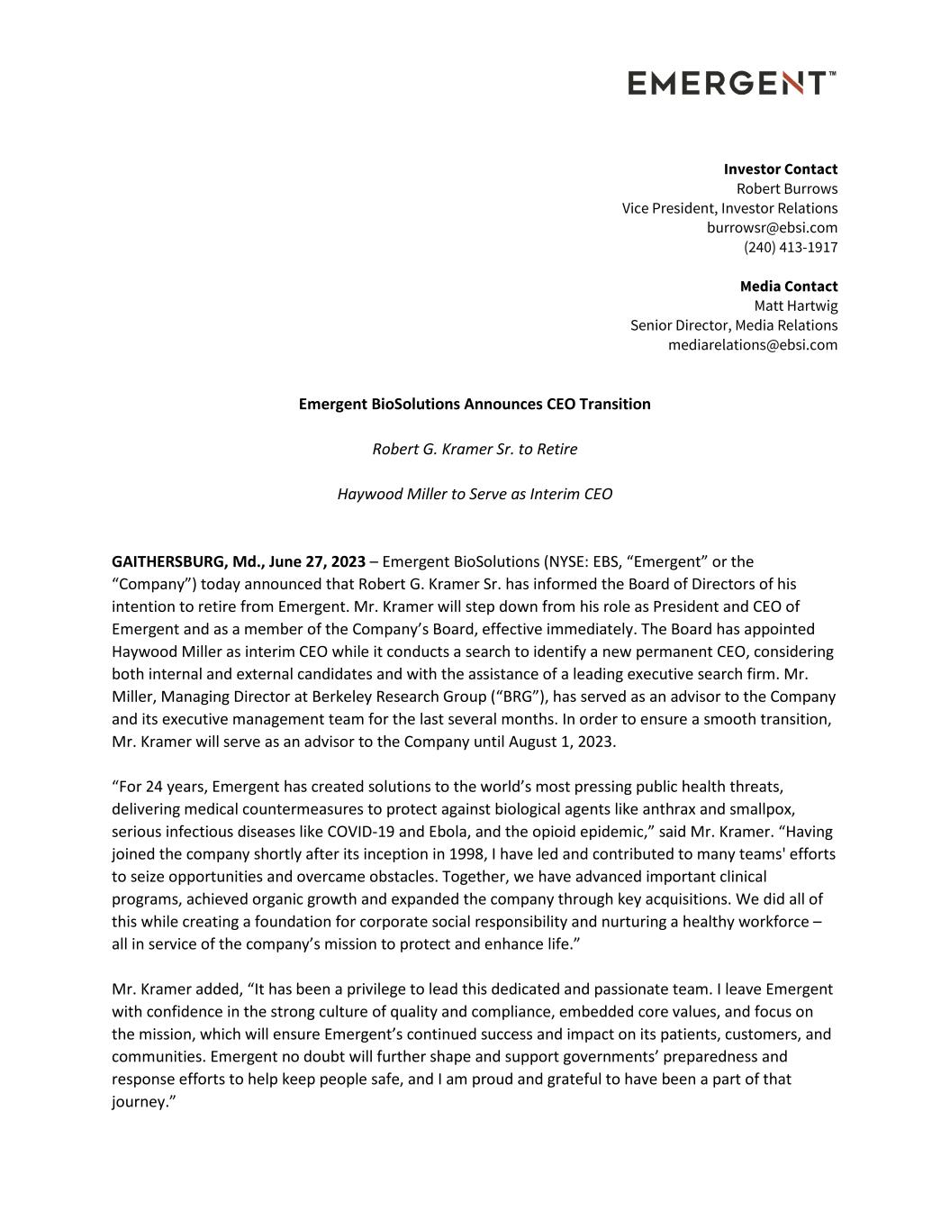 Investor Contact Robert Burrows Vice President, Investor Relations burrowsr@ebsi.com (240) 413-1917 Media Contact Matt Hartwig Senior Director, Media Relations mediarelations@ebsi.com Emergent BioSolutions Announces CEO Transition Robert G. Kramer Sr. to Retire Haywood Miller to Serve as Interim CEO GAITHERSBURG, Md., June 27, 2023 – Emergent BioSolutions (NYSE: EBS, “Emergent” or the “Company”) today announced that Robert G. Kramer Sr. has informed the Board of Directors of his intention to retire from Emergent. Mr. Kramer will step down from his role as President and CEO of Emergent and as a member of the Company’s Board, effective immediately. The Board has appointed Haywood Miller as interim CEO while it conducts a search to identify a new permanent CEO, considering both internal and external candidates and with the assistance of a leading executive search firm. Mr. Miller, Managing Director at Berkeley Research Group (“BRG”), has served as an advisor to the Company and its executive management team for the last several months. In order to ensure a smooth transition, Mr. Kramer will serve as an advisor to the Company until August 1, 2023. “For 24 years, Emergent has created solutions to the world’s most pressing public health threats, delivering medical countermeasures to protect against biological agents like anthrax and smallpox, serious infectious diseases like COVID-19 and Ebola, and the opioid epidemic,” said Mr. Kramer. “Having joined the company shortly after its inception in 1998, I have led and contributed to many teams' efforts to seize opportunities and overcame obstacles. Together, we have advanced important clinical programs, achieved organic growth and expanded the company through key acquisitions. We did all of this while creating a foundation for corporate social responsibility and nurturing a healthy workforce – all in service of the company’s mission to protect and enhance life.” Mr. Kramer added, “It has been a privilege to lead this dedicated and passionate team. I leave Emergent with confidence in the strong culture of quality and compliance, embedded core values, and focus on the mission, which will ensure Emergent’s continued success and impact on its patients, customers, and communities. Emergent no doubt will further shape and support governments’ preparedness and response efforts to help keep people safe, and I am proud and grateful to have been a part of that journey.” EMERGE N T'"