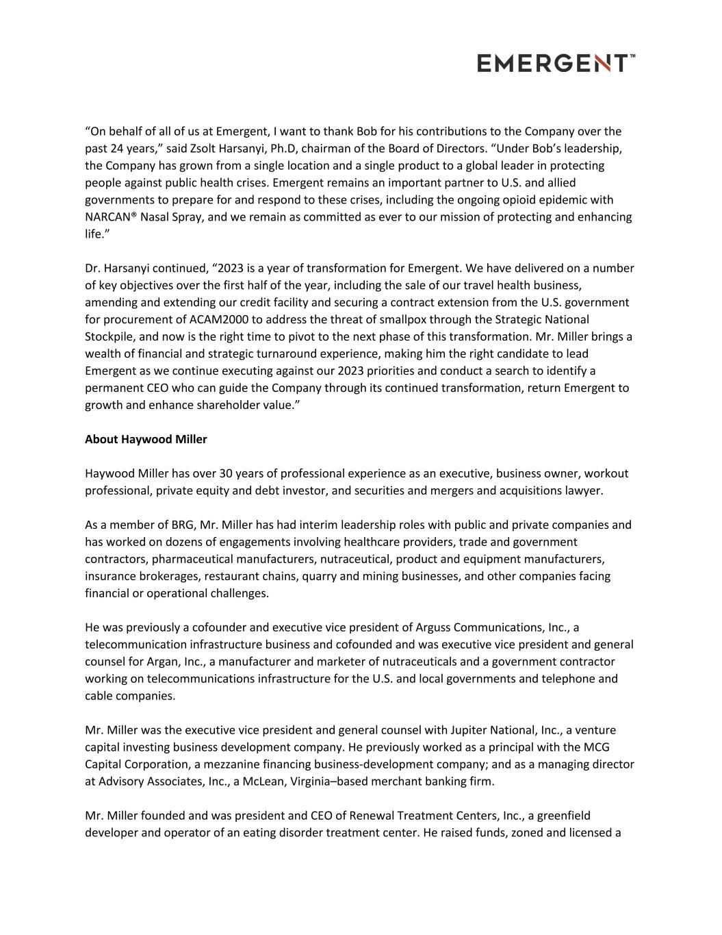 “On behalf of all of us at Emergent, I want to thank Bob for his contributions to the Company over the past 24 years,” said Zsolt Harsanyi, Ph.D, chairman of the Board of Directors. “Under Bob’s leadership, the Company has grown from a single location and a single product to a global leader in protecting people against public health crises. Emergent remains an important partner to U.S. and allied governments to prepare for and respond to these crises, including the ongoing opioid epidemic with NARCAN® Nasal Spray, and we remain as committed as ever to our mission of protecting and enhancing life.” Dr. Harsanyi continued, “2023 is a year of transformation for Emergent. We have delivered on a number of key objectives over the first half of the year, including the sale of our travel health business, amending and extending our credit facility and securing a contract extension from the U.S. government for procurement of ACAM2000 to address the threat of smallpox through the Strategic National Stockpile, and now is the right time to pivot to the next phase of this transformation. Mr. Miller brings a wealth of financial and strategic turnaround experience, making him the right candidate to lead Emergent as we continue executing against our 2023 priorities and conduct a search to identify a permanent CEO who can guide the Company through its continued transformation, return Emergent to growth and enhance shareholder value.” About Haywood Miller Haywood Miller has over 30 years of professional experience as an executive, business owner, workout professional, private equity and debt investor, and securities and mergers and acquisitions lawyer. As a member of BRG, Mr. Miller has had interim leadership roles with public and private companies and has worked on dozens of engagements involving healthcare providers, trade and government contractors, pharmaceutical manufacturers, nutraceutical, product and equipment manufacturers, insurance brokerages, restaurant chains, quarry and mining businesses, and other companies facing financial or operational challenges. He was previously a cofounder and executive vice president of Arguss Communications, Inc., a telecommunication infrastructure business and cofounded and was executive vice president and general counsel for Argan, Inc., a manufacturer and marketer of nutraceuticals and a government contractor working on telecommunications infrastructure for the U.S. and local governments and telephone and cable companies. Mr. Miller was the executive vice president and general counsel with Jupiter National, Inc., a venture capital investing business development company. He previously worked as a principal with the MCG Capital Corporation, a mezzanine financing business-development company; and as a managing director at Advisory Associates, Inc., a McLean, Virginia–based merchant banking firm. Mr. Miller founded and was president and CEO of Renewal Treatment Centers, Inc., a greenfield developer and operator of an eating disorder treatment center. He raised funds, zoned and licensed a EMERGE N T'"