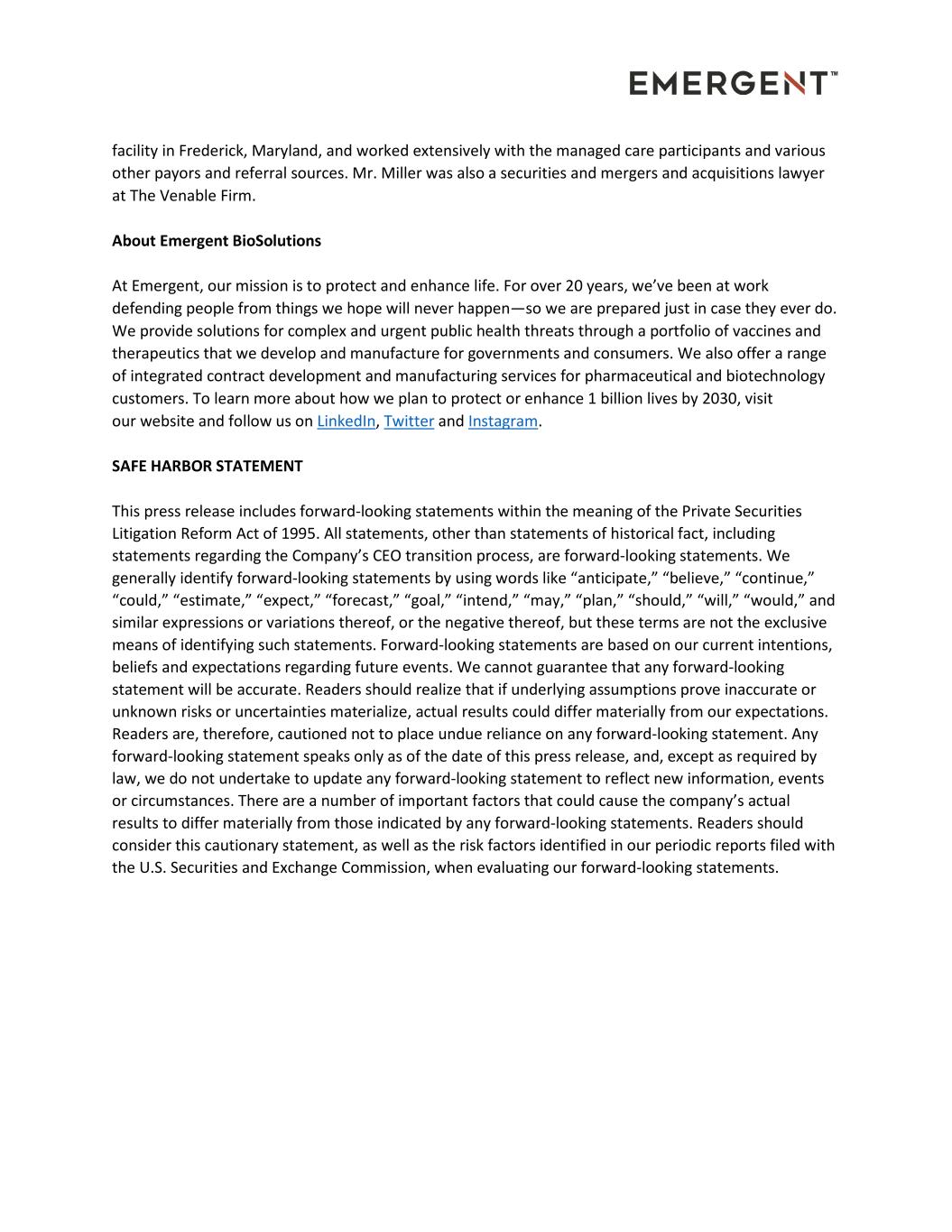 facility in Frederick, Maryland, and worked extensively with the managed care participants and various other payors and referral sources. Mr. Miller was also a securities and mergers and acquisitions lawyer at The Venable Firm. About Emergent BioSolutions At Emergent, our mission is to protect and enhance life. For over 20 years, we’ve been at work defending people from things we hope will never happen—so we are prepared just in case they ever do. We provide solutions for complex and urgent public health threats through a portfolio of vaccines and therapeutics that we develop and manufacture for governments and consumers. We also offer a range of integrated contract development and manufacturing services for pharmaceutical and biotechnology customers. To learn more about how we plan to protect or enhance 1 billion lives by 2030, visit our website and follow us on LinkedIn, Twitter and Instagram. SAFE HARBOR STATEMENT This press release includes forward-looking statements within the meaning of the Private Securities Litigation Reform Act of 1995. All statements, other than statements of historical fact, including statements regarding the Company’s CEO transition process, are forward-looking statements. We generally identify forward-looking statements by using words like “anticipate,” “believe,” “continue,” “could,” “estimate,” “expect,” “forecast,” “goal,” “intend,” “may,” “plan,” “should,” “will,” “would,” and similar expressions or variations thereof, or the negative thereof, but these terms are not the exclusive means of identifying such statements. Forward-looking statements are based on our current intentions, beliefs and expectations regarding future events. We cannot guarantee that any forward-looking statement will be accurate. Readers should realize that if underlying assumptions prove inaccurate or unknown risks or uncertainties materialize, actual results could differ materially from our expectations. Readers are, therefore, cautioned not to place undue reliance on any forward-looking statement. Any forward-looking statement speaks only as of the date of this press release, and, except as required by law, we do not undertake to update any forward-looking statement to reflect new information, events or circumstances. There are a number of important factors that could cause the company’s actual results to differ materially from those indicated by any forward-looking statements. Readers should consider this cautionary statement, as well as the risk factors identified in our periodic reports filed with the U.S. Securities and Exchange Commission, when evaluating our forward-looking statements. EMERGE NT'"