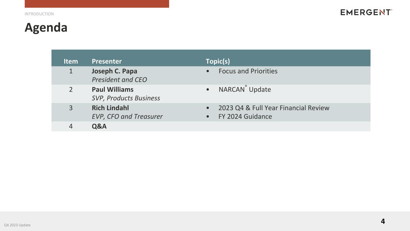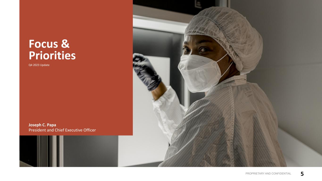 Agenda 4 Q4 2023 Update INTRODUCTION Item Presenter Topic(s) 1 Joseph C. Papa President and CEO • Focus and Priorities 2 Paul Williams SVP, Products Business • NARCAN® Update 3 Rich Lindahl EVP, CFO and Treasurer • 2023 Q4 & Full Year Financial Review • FY 2024 Guidance 4 Q&A