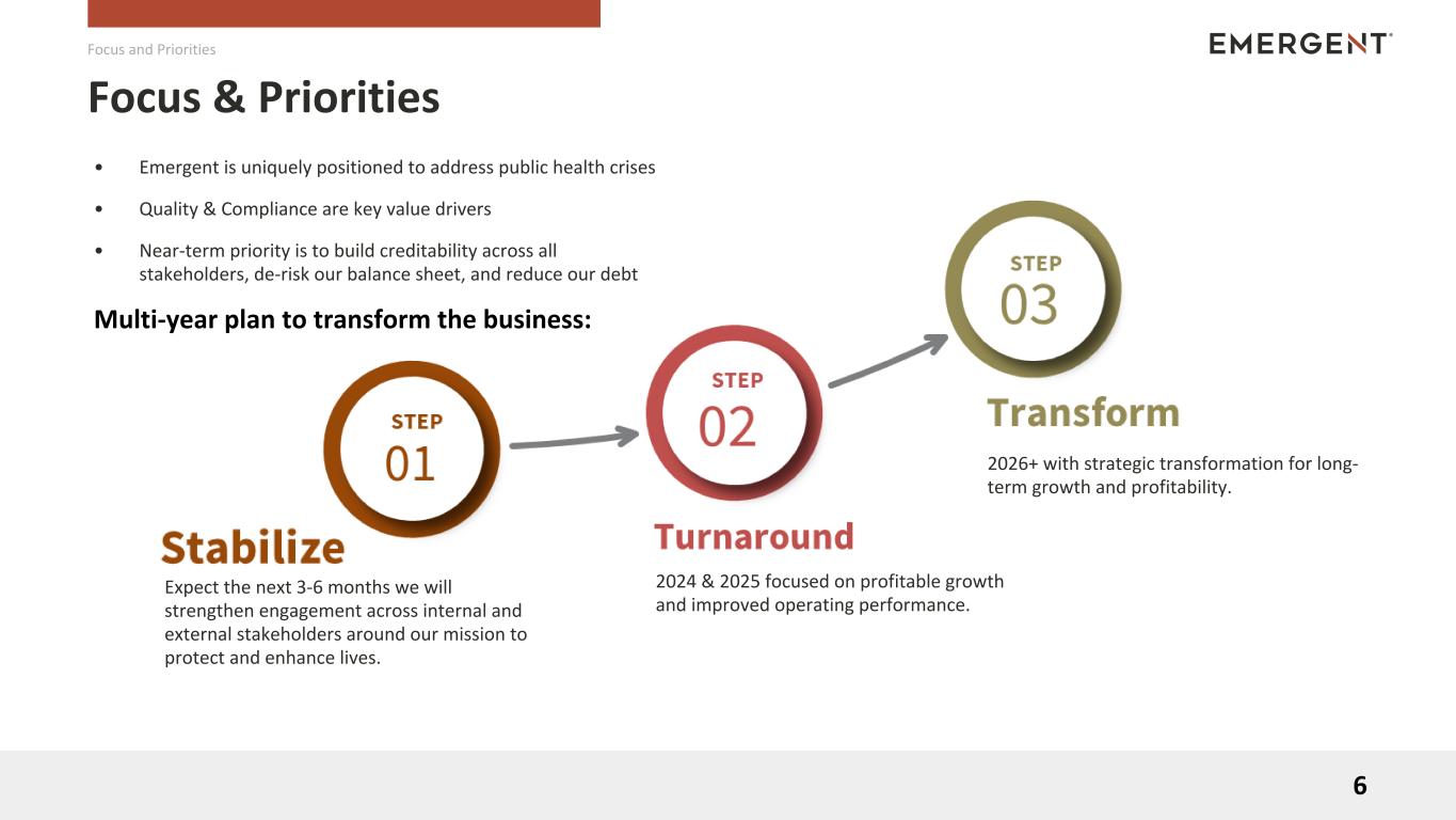 Focus & Priorities 6 Focus and Priorities • Emergent is uniquely positioned to address public health crises • Quality & Compliance are key value drivers • Near-term priority is to build creditability across all stakeholders, de-risk our balance sheet, and reduce our debt Multi-year plan to transform the business: Expect the next 3-6 months we will strengthen engagement across internal and external stakeholders around our mission to protect and enhance lives. 2024 & 2025 focused on profitable growth and improved operating performance. 2026+ with strategic transformation for long- term growth and profitability.