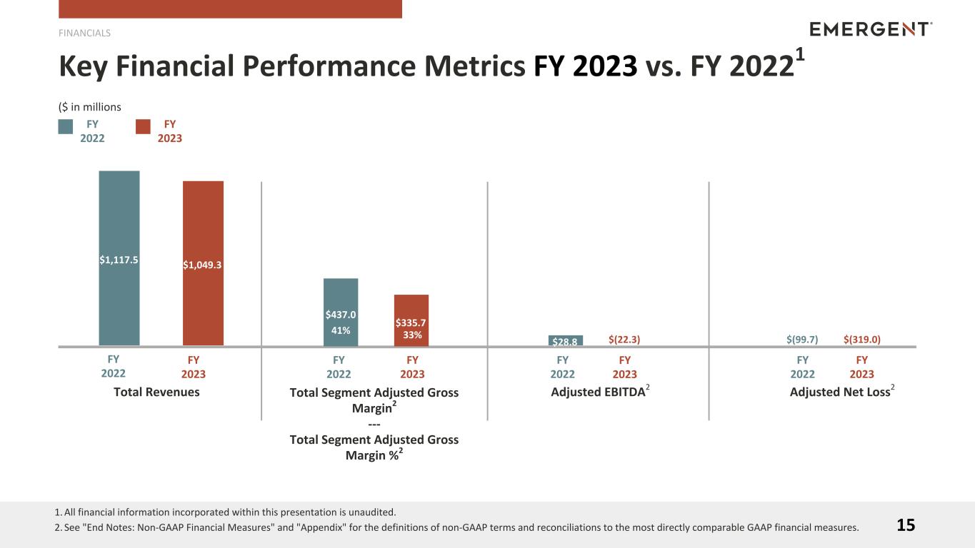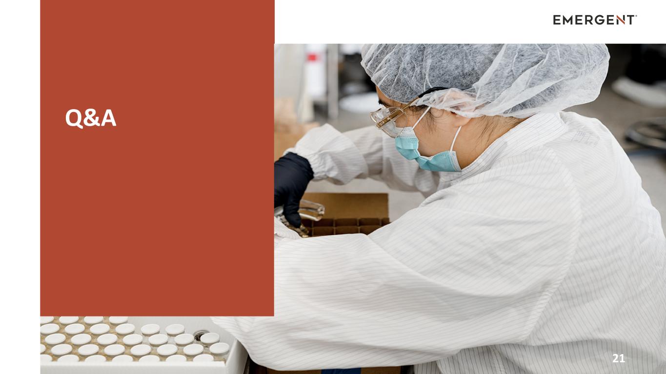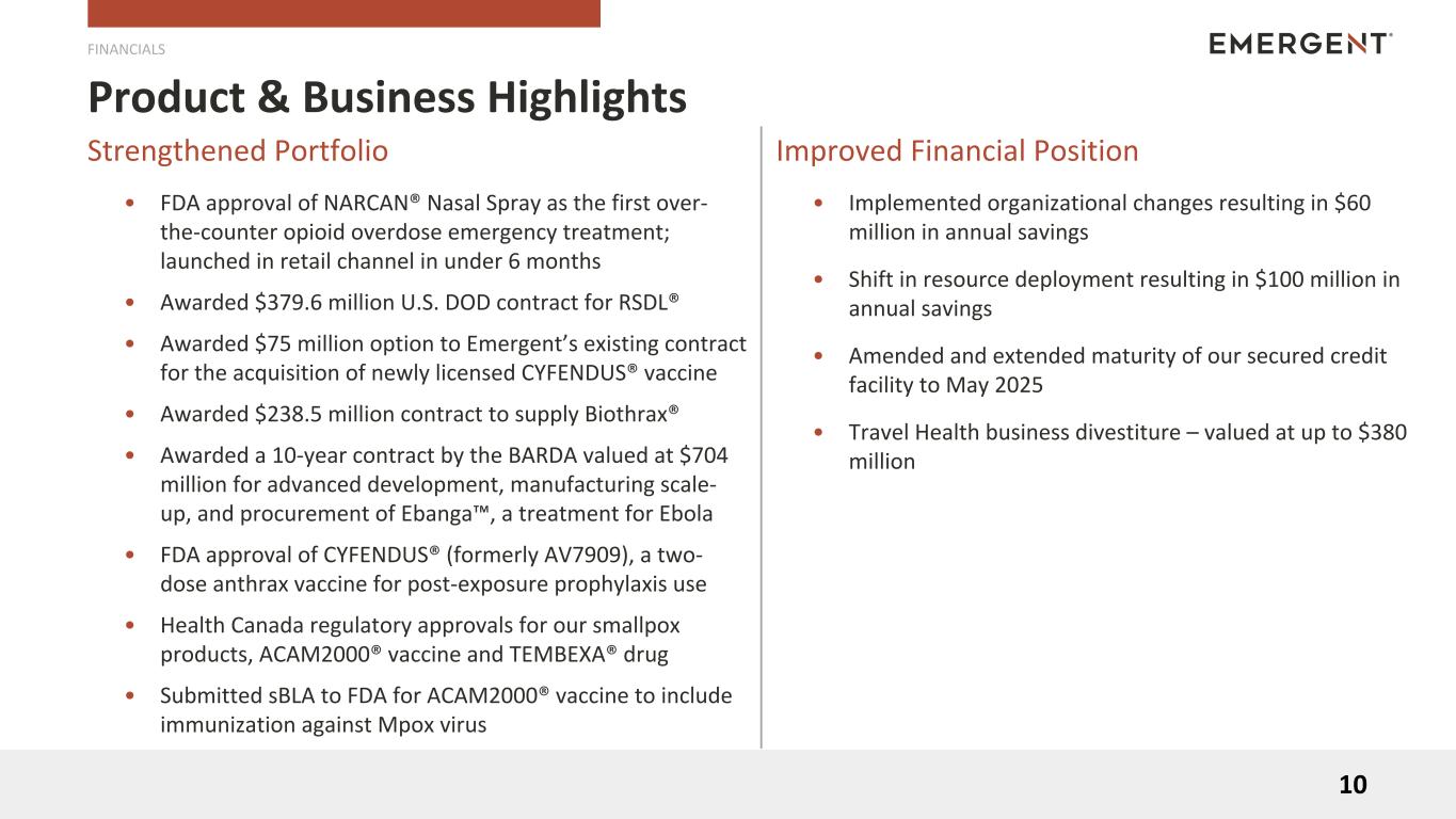 This presentation includes forward-looking statements within the meaning of the Private Securities Litigation Reform Act of 1995. All statements, other than statements of historical fact, including statements regarding the future performance of the Company or our business strategy, future operations, future financial position, future revenues and earnings, our ability to achieve the objectives of our restructuring initiatives, including our future results, projected costs, prospects, plans and objectives of management, are forward-looking statements. We generally identify forward-looking statements by using words like “anticipate,” “believe,” “continue,” “could,” “estimate,” “expect,” “forecast,” “future,” “goal,” “intend,” “may,” “plan,” “position,” “possible,” “potential,” “predict,” “project,” “should,” “target,” “will,” “would,” and similar expressions or variations thereof, or the negative thereof, but these terms are not the exclusive means of identifying such statements. Forward-looking statements are based on our current intentions, beliefs and expectations regarding future events based on information that is currently available. We cannot guarantee that any forward-looking statement will be accurate. Readers should realize that if underlying assumptions prove inaccurate or if known or unknown risks or uncertainties materialize, actual results could differ materially from our expectations. Readers are, therefore, cautioned not to place undue reliance on any forward-looking statement. Any forward-looking statement speaks only as of the date of this presentation, and, except as required by law, we do not undertake any obligation to update any forward-looking statement to reflect new information, events or circumstances. There are a number of important factors that could cause our actual results to differ materially from those indicated by such forward-looking statements, including, among others, the availability of USG funding for contracts related to procurement of our MCM products, including CYFENDUS® (Anthrax Vaccine Adsorbed (AVA), Adjuvanted), BioThrax® (Anthrax Vaccine Adsorbed), ACAM2000®, (Smallpox (Vaccinia) Vaccine, Live), among others, as well as contracts related to development of medical countermeasures; the availability of government funding for our other commercialized products, including EbangaTM (ansuvimab-zykl), BAT® (Botulism Antitoxin Heptavalent) and RSDL® (Reactive Skin Decontamination Lotion Kit); our ability to meet our commitments to quality and compliance in all of our manufacturing operations; our ability to negotiate additional USG procurement or follow-on contracts for our MCM products that have expired or will be expiring; the commercial availability and acceptance of over-the-counter NARCAN® (naloxone HCl) Nasal Spray; the impact of the generic marketplace on NARCAN® (naloxone HCI) Nasal Spray and future NARCAN® sales; our ability to perform under our contracts with the USG, including the timing of and specifications relating to deliveries; our ability to provide Bioservices for the development and/or manufacture of product and/or product candidates of our customers at required levels and on required timelines; the ability of our contractors and suppliers to maintain compliance with current good manufacturing practices and other regulatory obligations; our ability to negotiate further commitments related to the collaboration and deployment of capacity toward future commercial manufacturing under our existing Bioservices contracts; our ability to collect reimbursement for raw materials and payment of services fees from our Bioservices customers; the results of pending stockholder litigation and government investigations and their potential impact on our business; our ability to comply with the operating and financial covenants required by our senior secured credit facilities and the amended and restated credit agreement relating to such facilities, and our 3.875% Senior Unsecured Notes due 2028; our ability to resolve the going concern qualification in our consolidated financial statements and otherwise successfully manage our liquidity in order to continue as a going concern; the procurement of our product candidates by USG entities under regulatory authorities that permit government procurement of certain medical products prior to FDA marketing authorization, and corresponding procurement by government entities outside of the United States; our ability to realize the expected benefits of the sale of our travel health business to Bavarian Nordic; the impact of the organizational changes we announced in January 2023 and August 2023; our ability to identify and acquire companies, businesses, products or product candidates that satisfy our selection criteria; the impact of cyber security incidents, including the risks from the unauthorized access interruption, failure or compromise of our information systems or those of our business partners, collaborators or other third parties; the success of our commercialization, marketing and manufacturing capabilities and strategy; and the accuracy of our estimates regarding future revenues, expenses, capital requirements and needs for additional financing. The foregoing sets forth many, but not all, of the factors that could cause actual results to differ from our expectations in any forward-looking statement. Readers should consider this cautionary statement, as well as the risks identified in our periodic reports filed with the Securities and Exchange Commission, when evaluating our forward-looking statements. Trademarks Emergent®, BioThrax®, RSDL®, BAT®, ACAM2000®, NARCAN®, CYFENDUS® and any and all Emergent BioSolutions Inc. brands, products, services and feature names, logos and slogans are trademarks or registered trademarks of Emergent BioSolutions Inc. or its subsidiaries in the United States or other countri