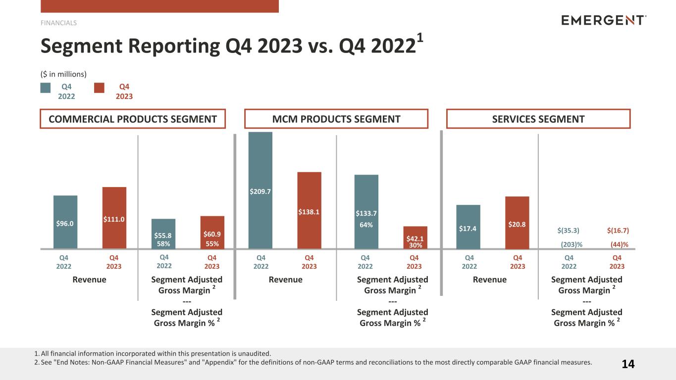 Key Financial Performance Metrics Q4 2023 vs. Q4 2022 1 13 SG&A $ --- SG&A Margin %2 FINANCIALS ($ in millions) 1.All financial information incorporated within this presentation is unaudited. 2. SG&A Margin is calculated as Gross SG&A Expense divided by total revenues. Q4 2022 Q4 2022 Q4 2022 Q4 2022 Q4 2022 Q4 2023 Q4 2023 Q4 2023 Q4 2023 Q4 2023 $47.0 $29.4 $93.4 $89.7 28% 32% Cost of Commercial Product Sales Cost of MCM Product Sales Cost of Bioservices R&D $ Q4 2023 Q4 2022 $40.2 $50.1 $127.6 $97.2 $52.7 $37.8