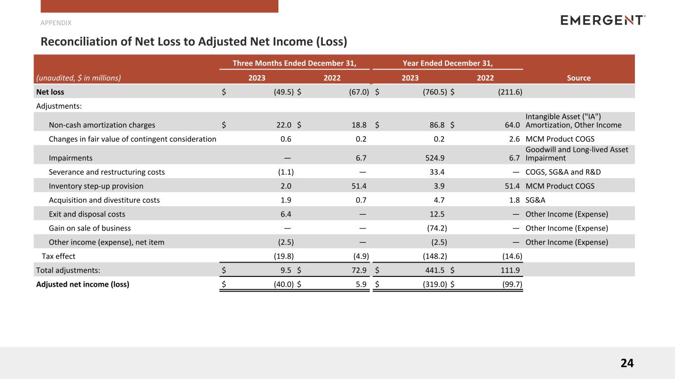 Reconciliation of Net Loss to Adjusted Net Income (Loss) 24 APPENDIX (unaudited, $ in millions) Three Months Ended December 31, Year Ended December 31, 2023 2022 2023 2022 Source Net loss $ (49.5) $ (67.0) $ (760.5) $ (211.6) Adjustments: Non-cash amortization charges $ 22.0 $ 18.8 $ 86.8 $ 64.0 Intangible Asset ("IA") Amortization, Other Income Changes in fair value of contingent consideration 0.6 0.2 0.2 2.6 MCM Product COGS Impairments — 6.7 524.9 6.7 Goodwill and Long-lived Asset Impairment Severance and restructuring costs (1.1) — 33.4 — COGS, SG&A and R&D Inventory step-up provision 2.0 51.4 3.9 51.4 MCM Product COGS Acquisition and divestiture costs 1.9 0.7 4.7 1.8 SG&A Exit and disposal costs 6.4 — 12.5 — Other Income (Expense) Gain on sale of business — — (74.2) — Other Income (Expense) Other income (expense), net item (2.5) — (2.5) — Other Income (Expense) Tax effect (19.8) (4.9) (148.2) (14.6) Total adjustments: $ 9.5 $ 72.9 $ 441.5 $ 111.9 Adjusted net income (loss) $ (40.0) $ 5.9 $ (319.0) $ (99.7)