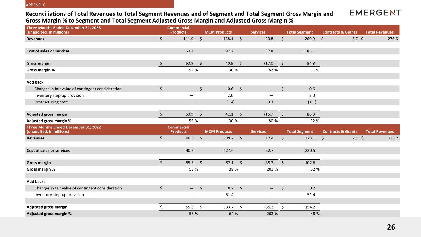 Reconciliations of Total Revenues to Total Segment Revenues and of Segment and Total Segment Gross Margin and Gross Margin % to Segment and Total Segment Adjusted Gross Margin and Adjusted Gross Margin % 27 APPENDIX Year Ended December 31, 2023 (unaudited, in millions) Commercial Products MCM Products Services Total Segment Contracts & Grants Total Revenues Revenues $ 497.3 $ 447.2 $ 78.5 $ 1,023.0 $ 26.3 $ 1,049.3 Cost of sales or services 210.3 305.6 189.5 705.4 Gross margin $ 287.0 $ 141.6 $ (111.0) $ 317.6 Gross margin % 58 % 32 % (141) % 31 % Add back: Changes in fair value of contingent consideration $ — $ 0.2 $ — $ 0.2 Inventory step-up provision — 3.9 — 3.9 Restructuring costs — 5.6 8.4 14.0 Adjusted gross margin $ 287.0 $ 151.3 $ (102.6) $ 335.7 Adjusted gross margin % 58 % 34 % (131) % 33 % Year Ended December 31, 2022 (in millions) Commercial Products MCM Products Services Total Segment Contracts & Grants Total Revenues Revenues $ 386.6 $ 579.6 $ 109.9 $ 1,076.1 $ 41.4 $ 1,117.5 Cost of sales or services 160.3 264.3 268.5 693.1 Gross margin $ 226.3 $ 315.3 $ (158.6) $ 383.0 Gross margin % 59 % 54 % (144) % 36 % Add back: Changes in fair value of contingent consideration $ — $ 2.6 $ — $ 2.6 Inventory step-up provision — 51.4 — 51.4 Adjusted gross margin $ 226.3 $ 369.3 $ (158.6) $ 437.0 Adjusted gross margin % 59 % 64 % (144) % 41 %