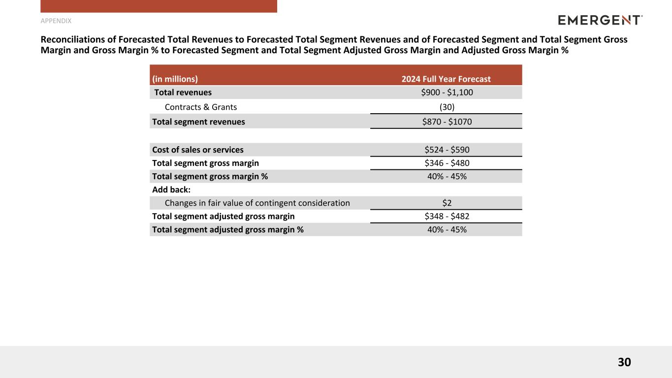 Reconciliation of Net Loss to Adjusted EBITDA – FY 2024 Forecast 29 APPENDIX ($ in millions) 2024 Full Year Forecast Net loss $(183) - $(133) Adjustments: Depreciation & amortization $111 Income taxes 59 Total interest expense, net 61 Changes in fair value of contingent consideration 2 Total adjustments $233 Adjusted EBITDA $50 - $100