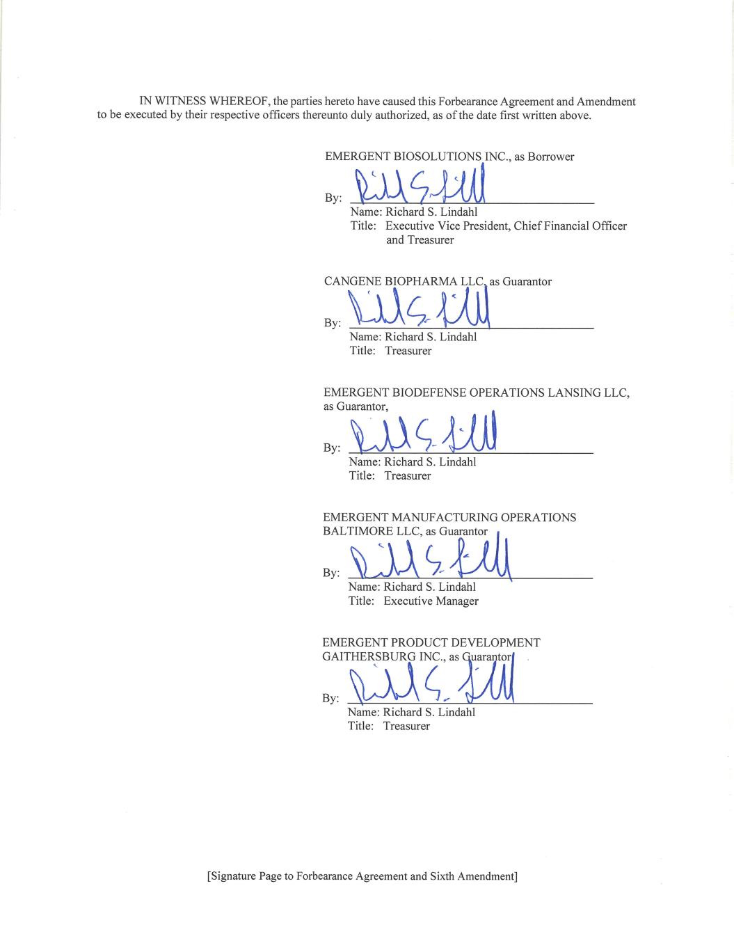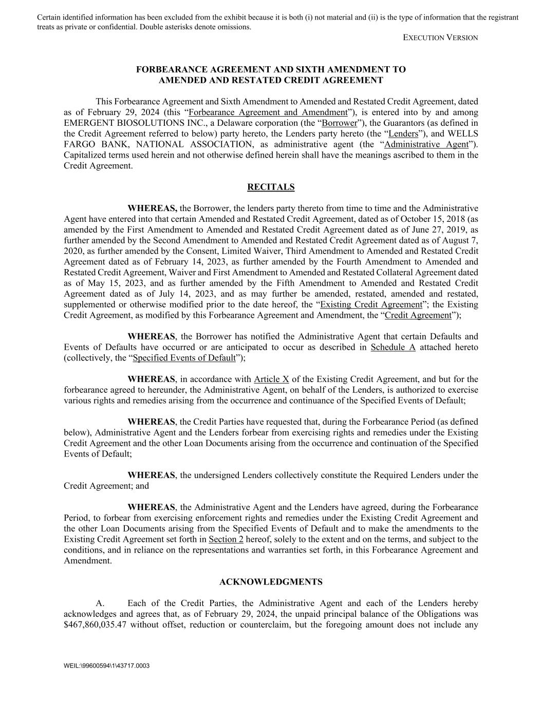 EXECUTION VERSION WEIL:\99600594\1\43717.0003 FORBEARANCE AGREEMENT AND SIXTH AMENDMENT TO AMENDED AND RESTATED CREDIT AGREEMENT This Forbearance Agreement and Sixth Amendment to Amended and Restated Credit Agreement, dated as of February 29, 2024 (this “Forbearance Agreement and Amendment”), is entered into by and among EMERGENT BIOSOLUTIONS INC., a Delaware corporation (the “Borrower”), the Guarantors (as defined in the Credit Agreement referred to below) party hereto, the Lenders party hereto (the “Lenders”), and WELLS FARGO BANK, NATIONAL ASSOCIATION, as administrative agent (the “Administrative Agent”). Capitalized terms used herein and not otherwise defined herein shall have the meanings ascribed to them in the Credit Agreement. RECITALS WHEREAS, the Borrower, the lenders party thereto from time to time and the Administrative Agent have entered into that certain Amended and Restated Credit Agreement, dated as of October 15, 2018 (as amended by the First Amendment to Amended and Restated Credit Agreement dated as of June 27, 2019, as further amended by the Second Amendment to Amended and Restated Credit Agreement dated as of August 7, 2020, as further amended by the Consent, Limited Waiver, Third Amendment to Amended and Restated Credit Agreement dated as of February 14, 2023, as further amended by the Fourth Amendment to Amended and Restated Credit Agreement, Waiver and First Amendment to Amended and Restated Collateral Agreement dated as of May 15, 2023, and as further amended by the Fifth Amendment to Amended and Restated Credit Agreement dated as of July 14, 2023, and as may further be amended, restated, amended and restated, supplemented or otherwise modified prior to the date hereof, the “Existing Credit Agreement”; the Existing Credit Agreement, as modified by this Forbearance Agreement and Amendment, the “Credit Agreement”); WHEREAS, the Borrower has notified the Administrative Agent that certain Defaults and Events of Defaults have occurred or are anticipated to occur as described in Schedule A attached hereto (collectively, the “Specified Events of Default”); WHEREAS, in accordance with Article X of the Existing Credit Agreement, and but for the forbearance agreed to hereunder, the Administrative Agent, on behalf of the Lenders, is authorized to exercise various rights and remedies arising from the occurrence and continuance of the Specified Events of Default; WHEREAS, the Credit Parties have requested that, during the Forbearance Period (as defined below), Administrative Agent and the Lenders forbear from exercising rights and remedies under the Existing Credit Agreement and the other Loan Documents arising from the occurrence and continuation of the Specified Events of Default; WHEREAS, the undersigned Lenders collectively constitute the Required Lenders under the Credit Agreement; and WHEREAS, the Administrative Agent and the Lenders have agreed, during the Forbearance Period, to forbear from exercising enforcement rights and remedies under the Existing Credit Agreement and the other Loan Documents arising from the Specified Events of Default and to make the amendments to the Existing Credit Agreement set forth in Section 2 hereof, solely to the extent and on the terms, and subject to the conditions, and in reliance on the representations and warranties set forth, in this Forbearance Agreement and Amendment. ACKNOWLEDGMENTS A. Each of the Credit Parties, the Administrative Agent and each of the Lenders hereby acknowledges and agrees that, as of February 29, 2024, the unpaid principal balance of the Obligations was $467,860,035.47 without offset, reduction or counterclaim, but the foregoing amount does not include any Certain identified information has been excluded from the exhibit because it is both (i) not material and (ii) is the type of information that the registrant treats as private or confidential. Double asterisks denote omissions.
