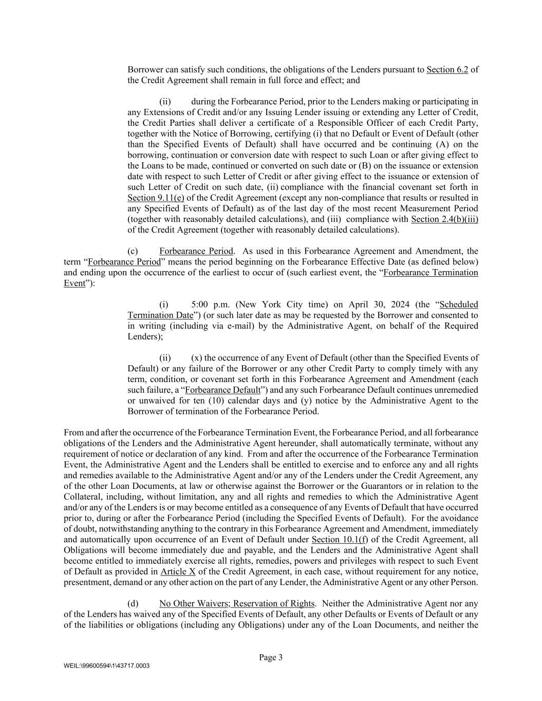 Page 3 WEIL:\99600594\1\43717.0003 Borrower can satisfy such conditions, the obligations of the Lenders pursuant to Section 6.2 of the Credit Agreement shall remain in full force and effect; and (ii) during the Forbearance Period, prior to the Lenders making or participating in any Extensions of Credit and/or any Issuing Lender issuing or extending any Letter of Credit, the Credit Parties shall deliver a certificate of a Responsible Officer of each Credit Party, together with the Notice of Borrowing, certifying (i) that no Default or Event of Default (other than the Specified Events of Default) shall have occurred and be continuing (A) on the borrowing, continuation or conversion date with respect to such Loan or after giving effect to the Loans to be made, continued or converted on such date or (B) on the issuance or extension date with respect to such Letter of Credit or after giving effect to the issuance or extension of such Letter of Credit on such date, (ii) compliance with the financial covenant set forth in Section 9.11(e) of the Credit Agreement (except any non-compliance that results or resulted in any Specified Events of Default) as of the last day of the most recent Measurement Period (together with reasonably detailed calculations), and (iii) compliance with Section 2.4(b)(iii) of the Credit Agreement (together with reasonably detailed calculations). (c) Forbearance Period. As used in this Forbearance Agreement and Amendment, the term “Forbearance Period” means the period beginning on the Forbearance Effective Date (as defined below) and ending upon the occurrence of the earliest to occur of (such earliest event, the “Forbearance Termination Event”): (i) 5:00 p.m. (New York City time) on April 30, 2024 (the “Scheduled Termination Date”) (or such later date as may be requested by the Borrower and consented to in writing (including via e-mail) by the Administrative Agent, on behalf of the Required Lenders); (ii) (x) the occurrence of any Event of Default (other than the Specified Events of Default) or any failure of the Borrower or any other Credit Party to comply timely with any term, condition, or covenant set forth in this Forbearance Agreement and Amendment (each such failure, a “Forbearance Default”) and any such Forbearance Default continues unremedied or unwaived for ten (10) calendar days and (y) notice by the Administrative Agent to the Borrower of termination of the Forbearance Period. From and after the occurrence of the Forbearance Termination Event, the Forbearance Period, and all forbearance obligations of the Lenders and the Administrative Agent hereunder, shall automatically terminate, without any requirement of notice or declaration of any kind. From and after the occurrence of the Forbearance Termination Event, the Administrative Agent and the Lenders shall be entitled to exercise and to enforce any and all rights and remedies available to the Administrative Agent and/or any of the Lenders under the Credit Agreement, any of the other Loan Documents, at law or otherwise against the Borrower or the Guarantors or in relation to the Collateral, including, without limitation, any and all rights and remedies to which the Administrative Agent and/or any of the Lenders is or may become entitled as a consequence of any Events of Default that have occurred prior to, during or after the Forbearance Period (including the Specified Events of Default). For the avoidance of doubt, notwithstanding anything to the contrary in this Forbearance Agreement and Amendment, immediately and automatically upon occurrence of an Event of Default under Section 10.1(f) of the Credit Agreement, all Obligations will become immediately due and payable, and the Lenders and the Administrative Agent shall become entitled to immediately exercise all rights, remedies, powers and privileges with respect to such Event of Default as provided in Article X of the Credit Agreement, in each case, without requirement for any notice, presentment, demand or any other action on the part of any Lender, the Administrative Agent or any other Person. (d) No Other Waivers; Reservation of Rights. Neither the Administrative Agent nor any of the Lenders has waived any of the Specified Events of Default, any other Defaults or Events of Default or any of the liabilities or obligations (including any Obligations) under any of the Loan Documents, and neither the