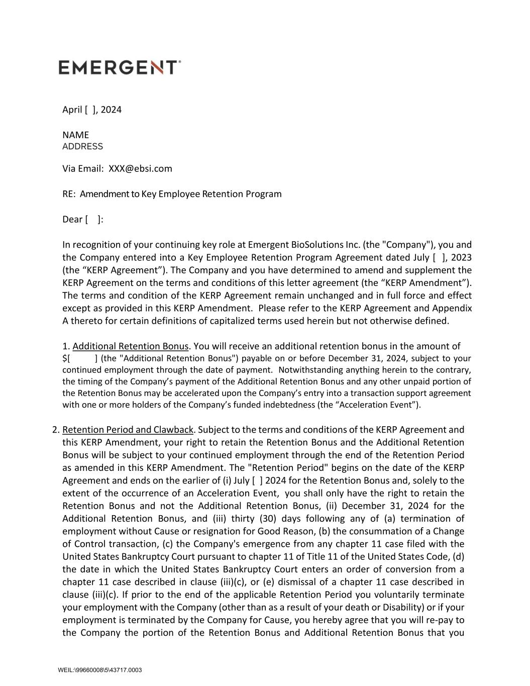WEIL:\99660008\5\43717.0003 April [ ], 2024 NAME ADDRESS Via Email: XXX@ebsi.com RE: Amendment to Key Employee Retention Program Dear [ ]: In recognition of your continuing key role at Emergent BioSolutions Inc. (the "Company"), you and the Company entered into a Key Employee Retention Program Agreement dated July [ ], 2023 (the “KERP Agreement”). The Company and you have determined to amend and supplement the KERP Agreement on the terms and conditions of this letter agreement (the “KERP Amendment”). The terms and condition of the KERP Agreement remain unchanged and in full force and effect except as provided in this KERP Amendment. Please refer to the KERP Agreement and Appendix A thereto for certain definitions of capitalized terms used herein but not otherwise defined. 1. Additional Retention Bonus. You will receive an additional retention bonus in the amount of $[ ] (the "Additional Retention Bonus") payable on or before December 31, 2024, subject to your continued employment through the date of payment. Notwithstanding anything herein to the contrary, the timing of the Company’s payment of the Additional Retention Bonus and any other unpaid portion of the Retention Bonus may be accelerated upon the Company’s entry into a transaction support agreement with one or more holders of the Company’s funded indebtedness (the “Acceleration Event”). 2. Retention Period and Clawback. Subject to the terms and conditions of the KERP Agreement and this KERP Amendment, your right to retain the Retention Bonus and the Additional Retention Bonus will be subject to your continued employment through the end of the Retention Period as amended in this KERP Amendment. The "Retention Period" begins on the date of the KERP Agreement and ends on the earlier of (i) July [ ] 2024 for the Retention Bonus and, solely to the extent of the occurrence of an Acceleration Event, you shall only have the right to retain the Retention Bonus and not the Additional Retention Bonus, (ii) December 31, 2024 for the Additional Retention Bonus, and (iii) thirty (30) days following any of (a) termination of employment without Cause or resignation for Good Reason, (b) the consummation of a Change of Control transaction, (c) the Company's emergence from any chapter 11 case filed with the United States Bankruptcy Court pursuant to chapter 11 of Title 11 of the United States Code, (d) the date in which the United States Bankruptcy Court enters an order of conversion from a chapter 11 case described in clause (iii)(c), or (e) dismissal of a chapter 11 case described in clause (iii)(c). If prior to the end of the applicable Retention Period you voluntarily terminate your employment with the Company (other than as a result of your death or Disability) or if your employment is terminated by the Company for Cause, you hereby agree that you will re-pay to the Company the portion of the Retention Bonus and Additional Retention Bonus that you