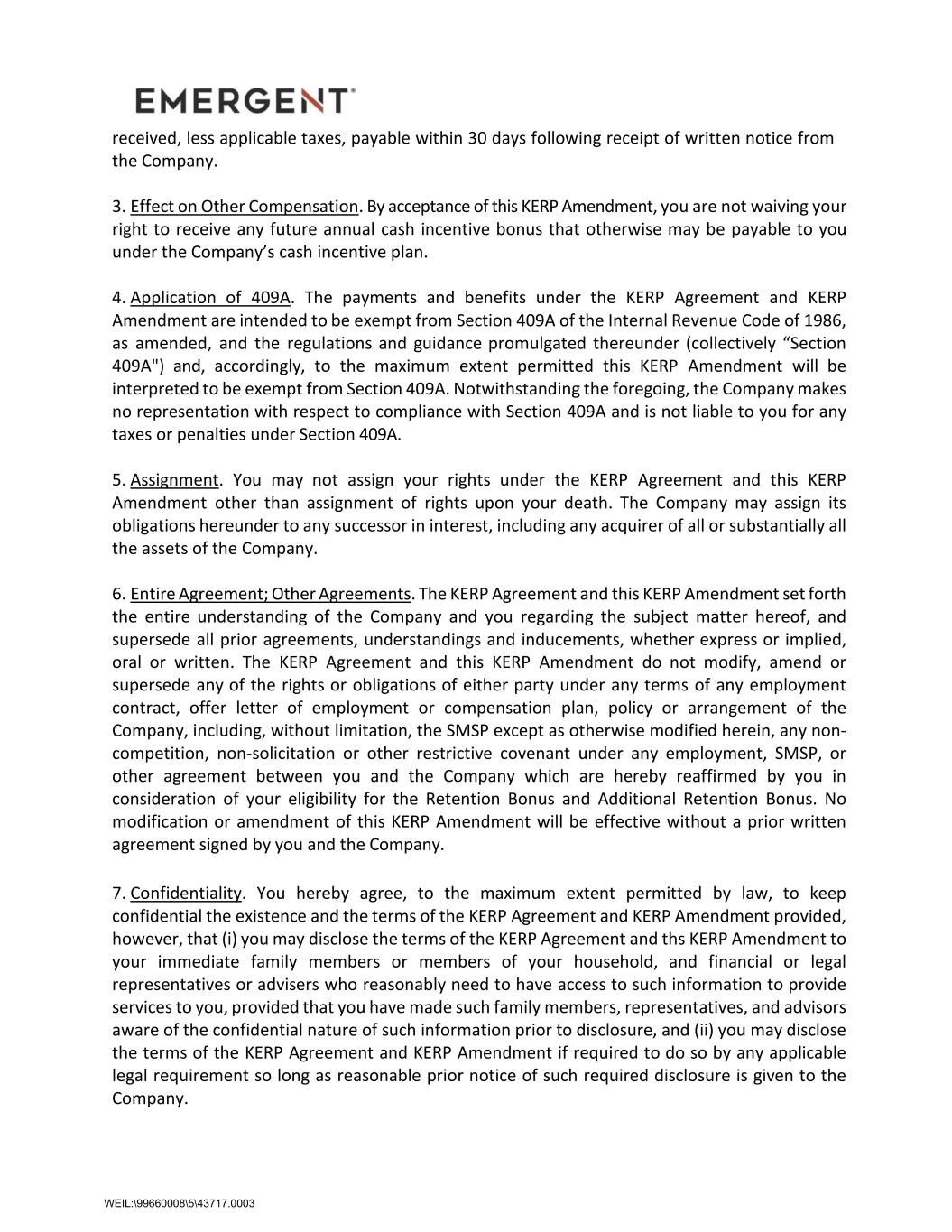 WEIL:\99660008\5\43717.0003 received, less applicable taxes, payable within 30 days following receipt of written notice from the Company. 3. Effect on Other Compensation. By acceptance of this KERP Amendment, you are not waiving your right to receive any future annual cash incentive bonus that otherwise may be payable to you under the Company’s cash incentive plan. 4. Application of 409A. The payments and benefits under the KERP Agreement and KERP Amendment are intended to be exempt from Section 409A of the Internal Revenue Code of 1986, as amended, and the regulations and guidance promulgated thereunder (collectively “Section 409A") and, accordingly, to the maximum extent permitted this KERP Amendment will be interpreted to be exempt from Section 409A. Notwithstanding the foregoing, the Company makes no representation with respect to compliance with Section 409A and is not liable to you for any taxes or penalties under Section 409A. 5. Assignment. You may not assign your rights under the KERP Agreement and this KERP Amendment other than assignment of rights upon your death. The Company may assign its obligations hereunder to any successor in interest, including any acquirer of all or substantially all the assets of the Company. 6. Entire Agreement; Other Agreements. The KERP Agreement and this KERP Amendment set forth the entire understanding of the Company and you regarding the subject matter hereof, and supersede all prior agreements, understandings and inducements, whether express or implied, oral or written. The KERP Agreement and this KERP Amendment do not modify, amend or supersede any of the rights or obligations of either party under any terms of any employment contract, offer letter of employment or compensation plan, policy or arrangement of the Company, including, without limitation, the SMSP except as otherwise modified herein, any non- competition, non-solicitation or other restrictive covenant under any employment, SMSP, or other agreement between you and the Company which are hereby reaffirmed by you in consideration of your eligibility for the Retention Bonus and Additional Retention Bonus. No modification or amendment of this KERP Amendment will be effective without a prior written agreement signed by you and the Company. 7. Confidentiality. You hereby agree, to the maximum extent permitted by law, to keep confidential the existence and the terms of the KERP Agreement and KERP Amendment provided, however, that (i) you may disclose the terms of the KERP Agreement and ths KERP Amendment to your immediate family members or members of your household, and financial or legal representatives or advisers who reasonably need to have access to such information to provide services to you, provided that you have made such family members, representatives, and advisors aware of the confidential nature of such information prior to disclosure, and (ii) you may disclose the terms of the KERP Agreement and KERP Amendment if required to do so by any applicable legal requirement so long as reasonable prior notice of such required disclosure is given to the Company.
