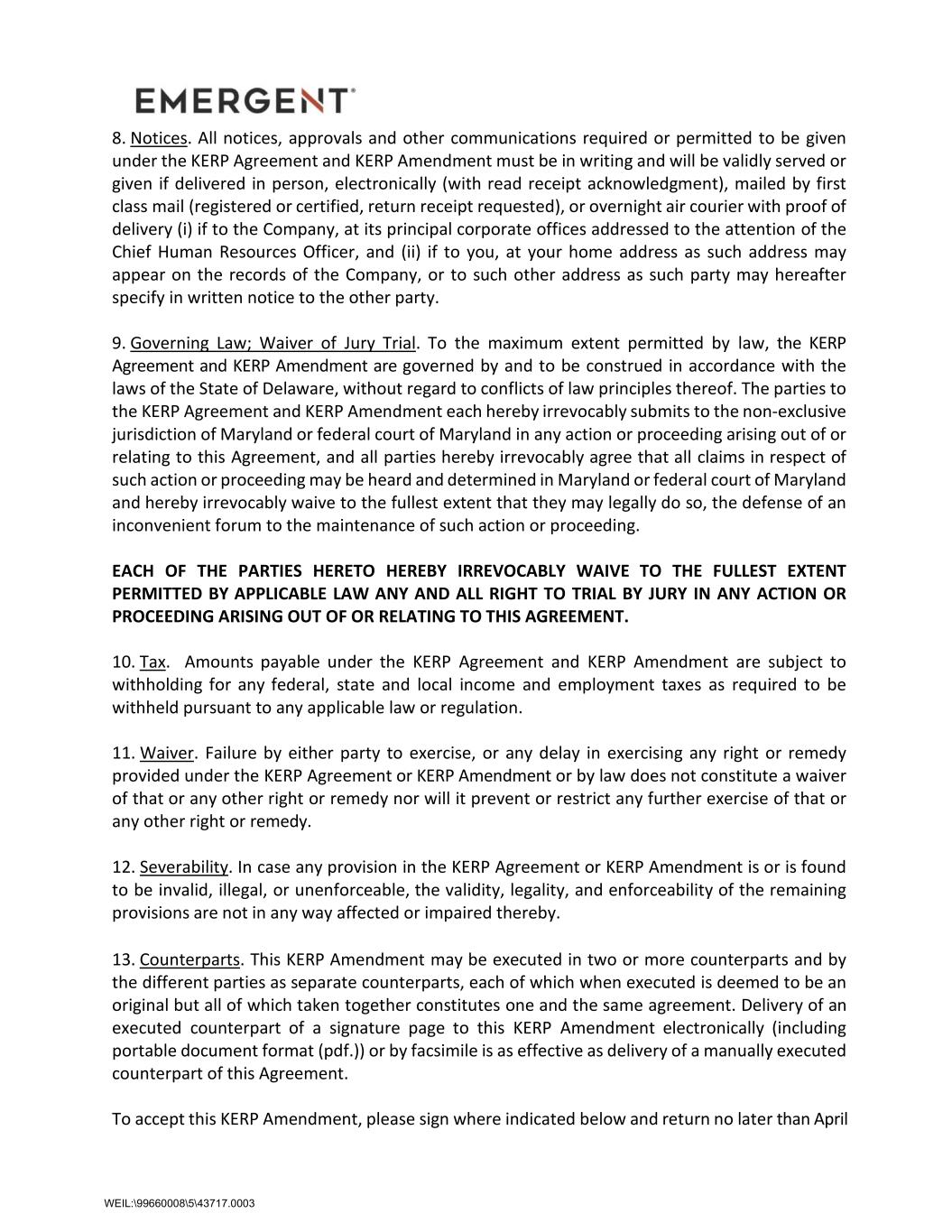 WEIL:\99660008\5\43717.0003 8. Notices. All notices, approvals and other communications required or permitted to be given under the KERP Agreement and KERP Amendment must be in writing and will be validly served or given if delivered in person, electronically (with read receipt acknowledgment), mailed by first class mail (registered or certified, return receipt requested), or overnight air courier with proof of delivery (i) if to the Company, at its principal corporate offices addressed to the attention of the Chief Human Resources Officer, and (ii) if to you, at your home address as such address may appear on the records of the Company, or to such other address as such party may hereafter specify in written notice to the other party. 9. Governing Law; Waiver of Jury Trial. To the maximum extent permitted by law, the KERP Agreement and KERP Amendment are governed by and to be construed in accordance with the laws of the State of Delaware, without regard to conflicts of law principles thereof. The parties to the KERP Agreement and KERP Amendment each hereby irrevocably submits to the non-exclusive jurisdiction of Maryland or federal court of Maryland in any action or proceeding arising out of or relating to this Agreement, and all parties hereby irrevocably agree that all claims in respect of such action or proceeding may be heard and determined in Maryland or federal court of Maryland and hereby irrevocably waive to the fullest extent that they may legally do so, the defense of an inconvenient forum to the maintenance of such action or proceeding. EACH OF THE PARTIES HERETO HEREBY IRREVOCABLY WAIVE TO THE FULLEST EXTENT PERMITTED BY APPLICABLE LAW ANY AND ALL RIGHT TO TRIAL BY JURY IN ANY ACTION OR PROCEEDING ARISING OUT OF OR RELATING TO THIS AGREEMENT. 10. Tax. Amounts payable under the KERP Agreement and KERP Amendment are subject to withholding for any federal, state and local income and employment taxes as required to be withheld pursuant to any applicable law or regulation. 11. Waiver. Failure by either party to exercise, or any delay in exercising any right or remedy provided under the KERP Agreement or KERP Amendment or by law does not constitute a waiver of that or any other right or remedy nor will it prevent or restrict any further exercise of that or any other right or remedy. 12. Severability. In case any provision in the KERP Agreement or KERP Amendment is or is found to be invalid, illegal, or unenforceable, the validity, legality, and enforceability of the remaining provisions are not in any way affected or impaired thereby. 13. Counterparts. This KERP Amendment may be executed in two or more counterparts and by the different parties as separate counterparts, each of which when executed is deemed to be an original but all of which taken together constitutes one and the same agreement. Delivery of an executed counterpart of a signature page to this KERP Amendment electronically (including portable document format (pdf.)) or by facsimile is as effective as delivery of a manually executed counterpart of this Agreement. To accept this KERP Amendment, please sign where indicated below and return no later than April